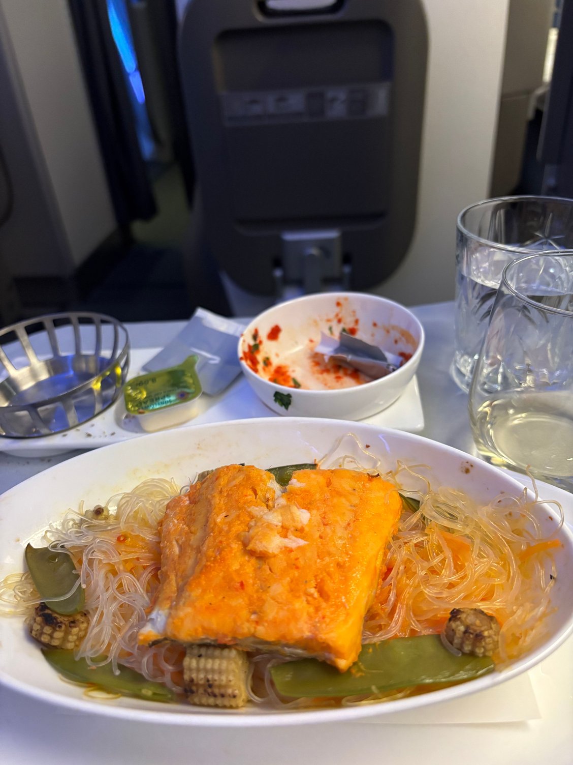 Fish on rice noodles with almost burnt mini cob corn. Overcooked and not pleasant. Good thing I wasn’t that hungry. I forgot to take a pic of the main menu but it was Lamb or Cod and something else. Starter was smoked salmon and prawns or red lentil soup and another choice. I’ll stick to the ordinary one for the return.