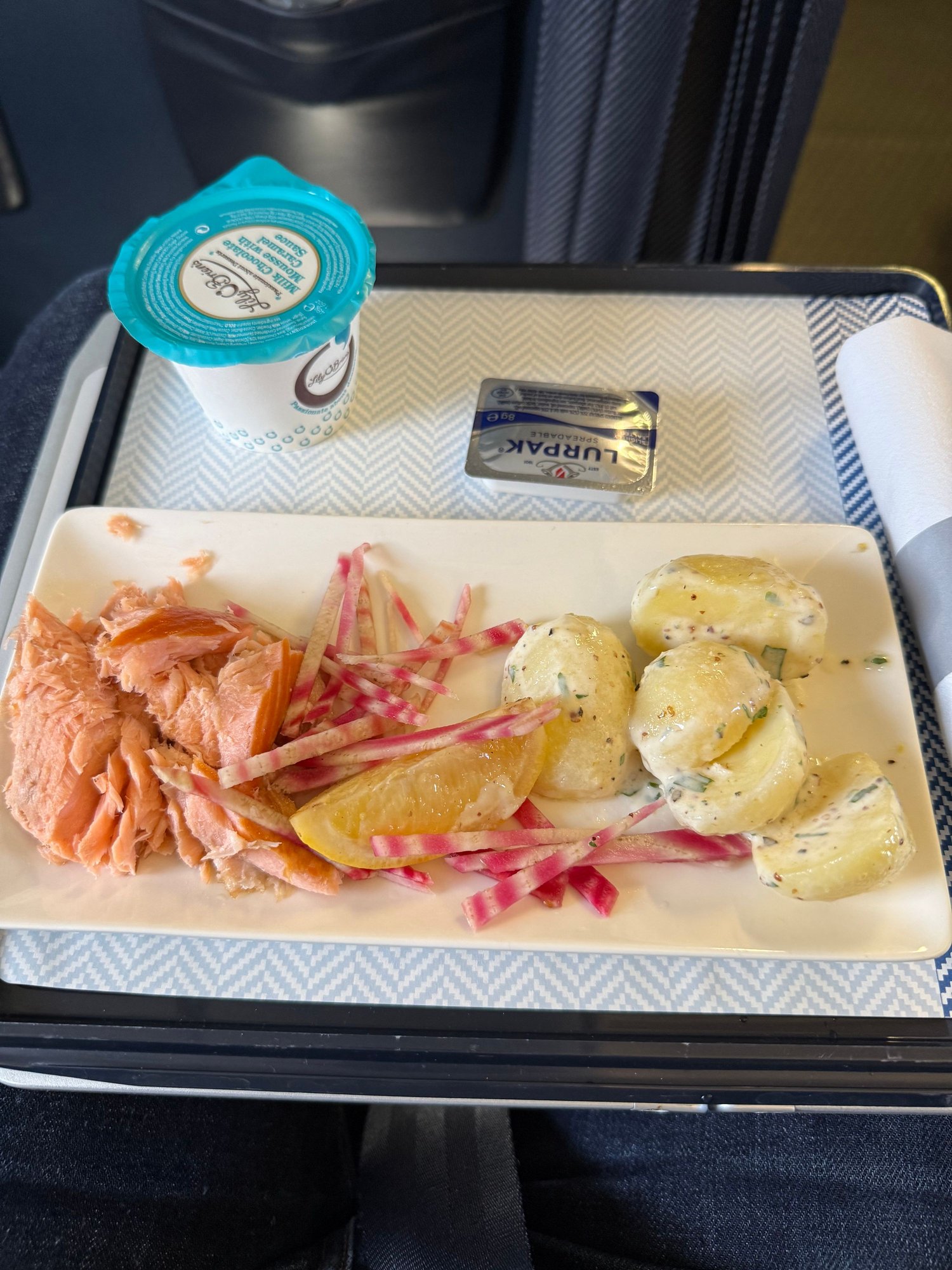 Ordered a GFML for this lunchtime flight up to Edinburgh, it wasn't loaded, but the regular option turned out to be GF. Hot smoked salmon with a beet salad and horseradish potatoes, chocolate mouse with salted caramel pot for dessert. Both were really tasty.