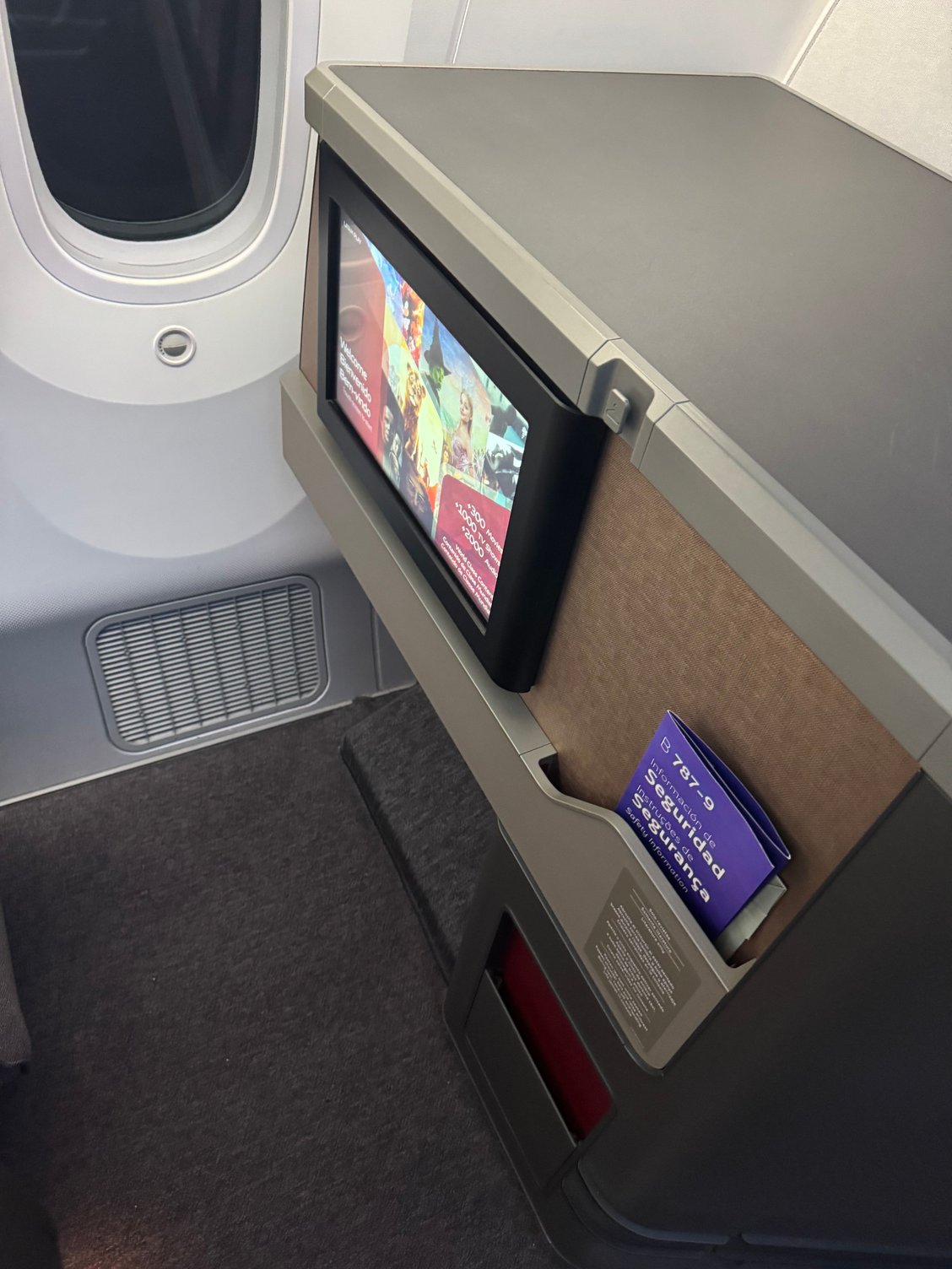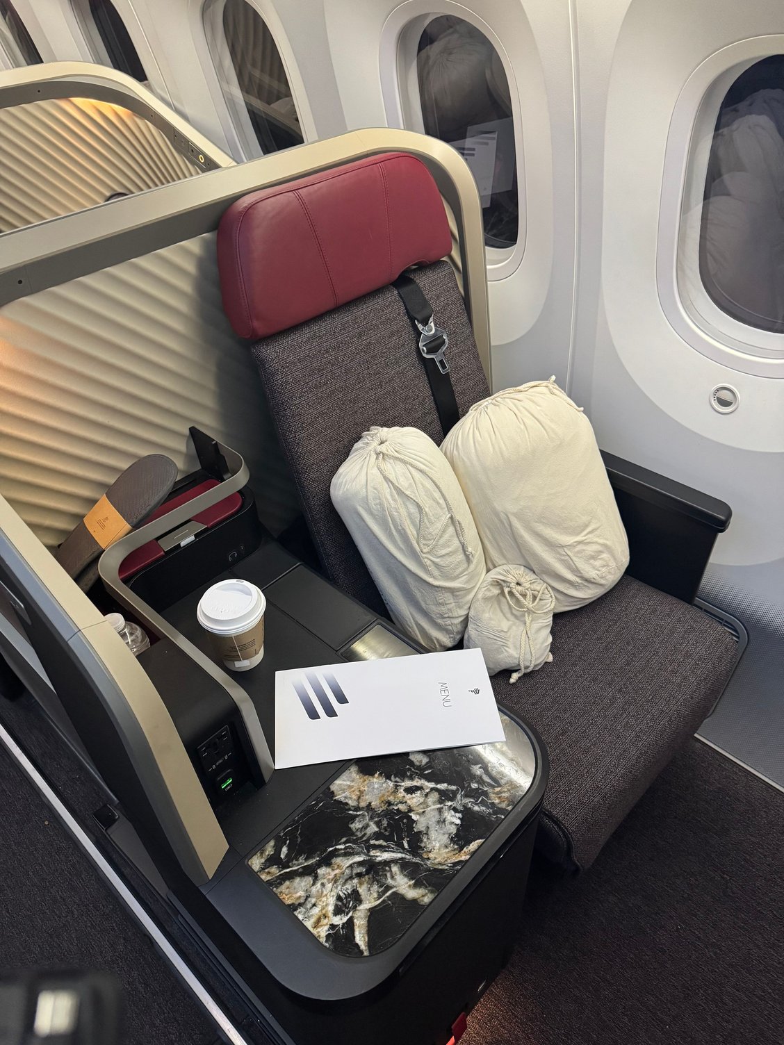 The boarding process was painless and I was soon at my seat, 1A. It’s a very nice seat-my only complaint is the lack of privacy doors. However, the width/shoulder room seemed better than my typical AF A359 routine. Below, you can find a few photos of the seat:
