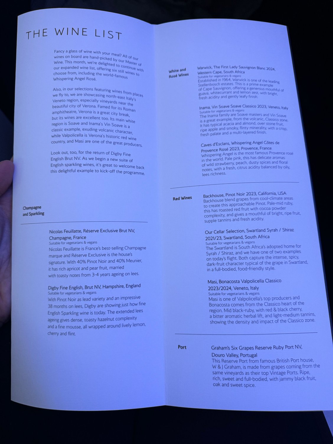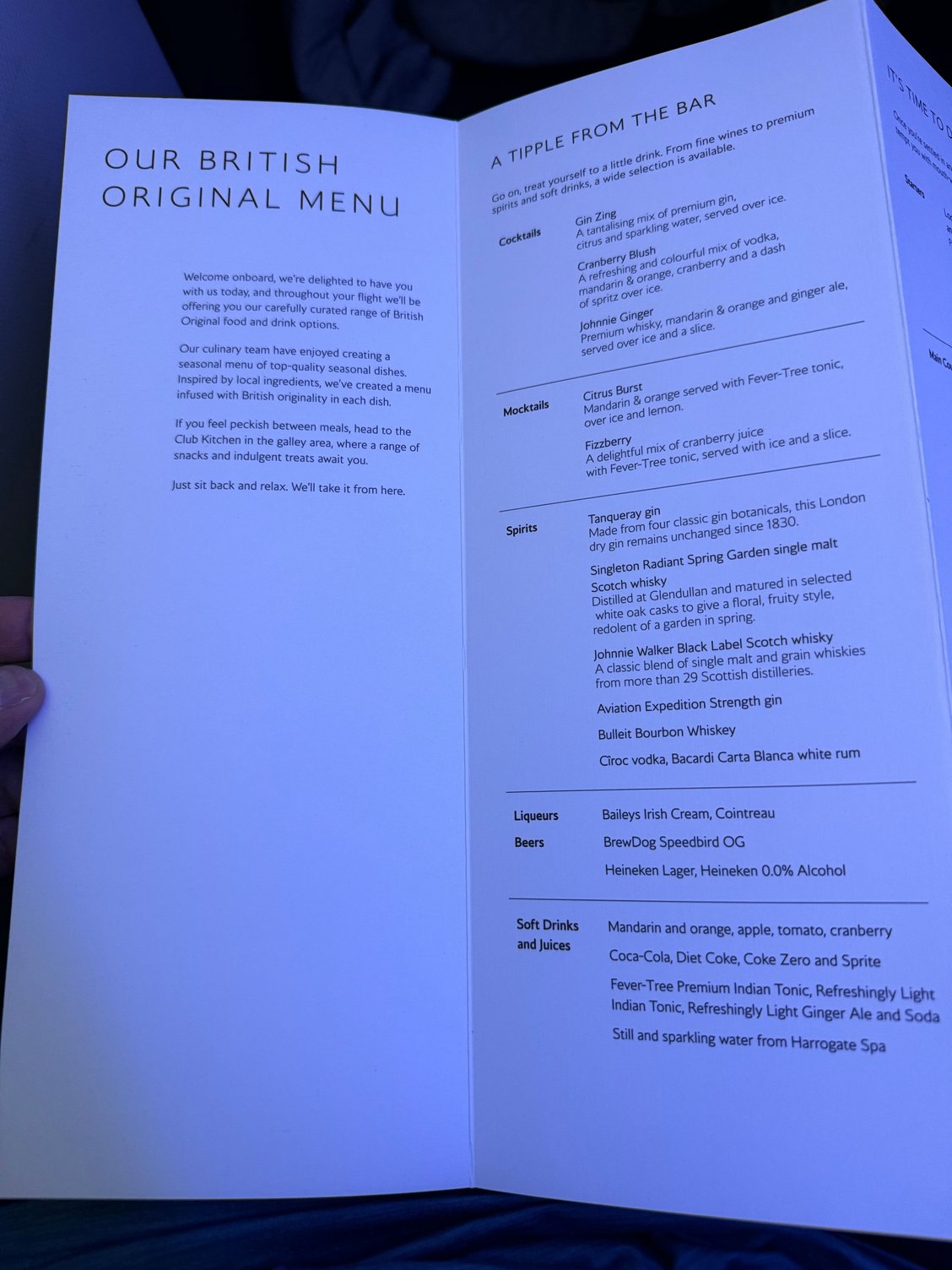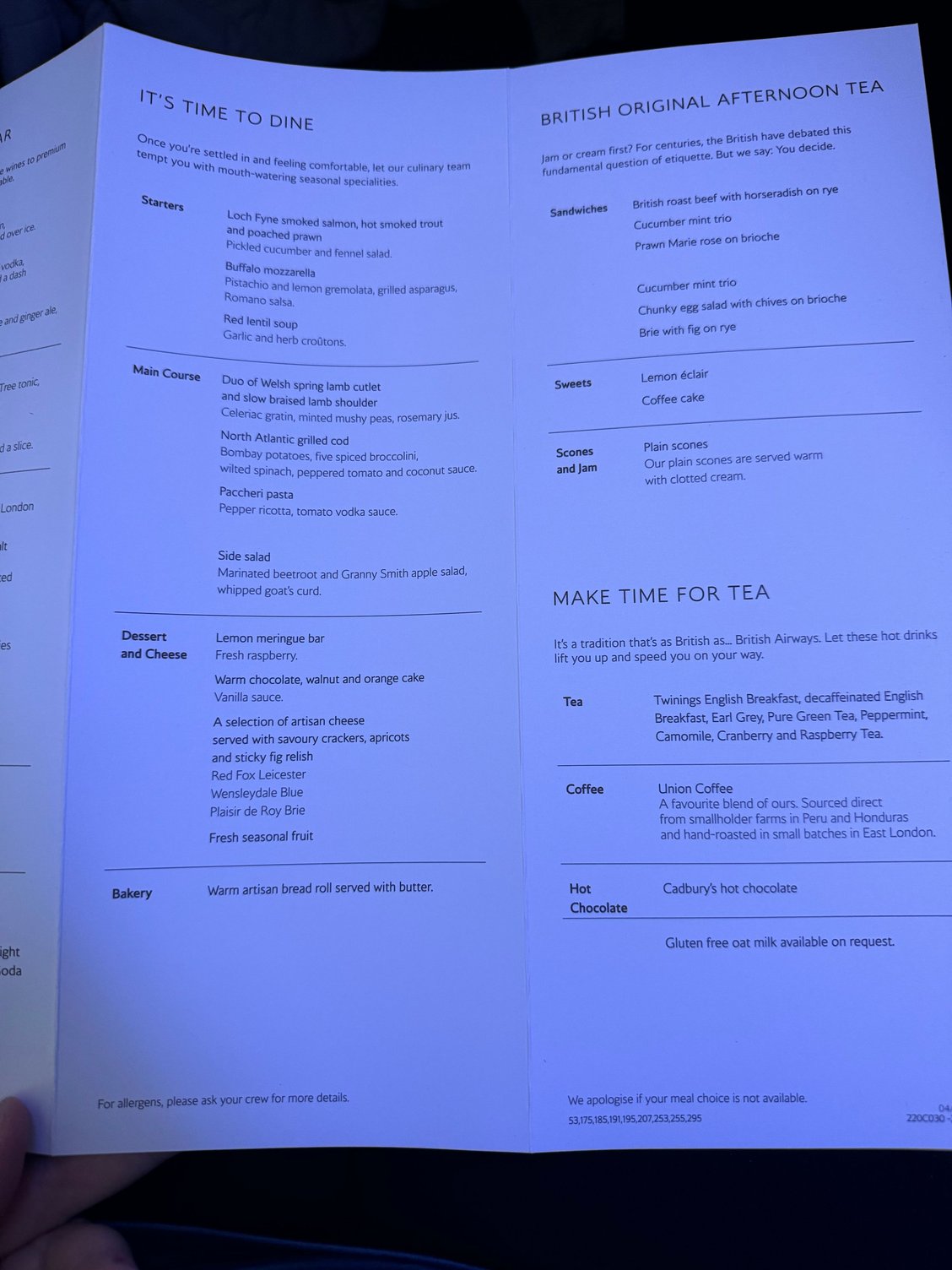 Menu from photos was the LHR to NAS portion, didn’t eat the first meal but the tea was good.