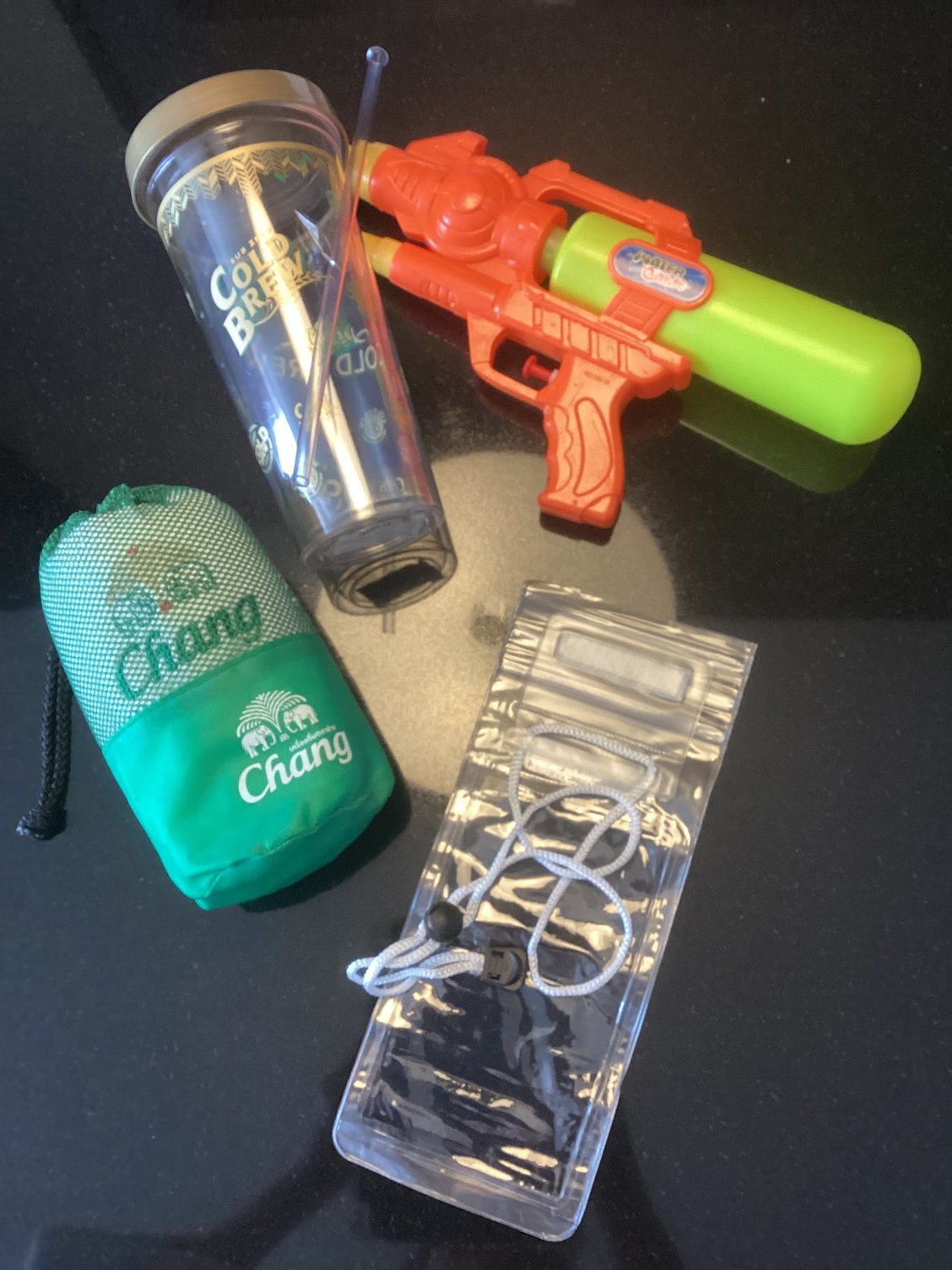 Water pistol, phone pouch, keep cup and towel for Songkran.