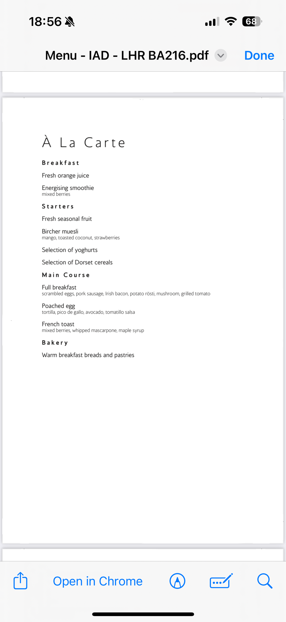 BA 216 IAD - LHR later in the month, menus provided by Your First.