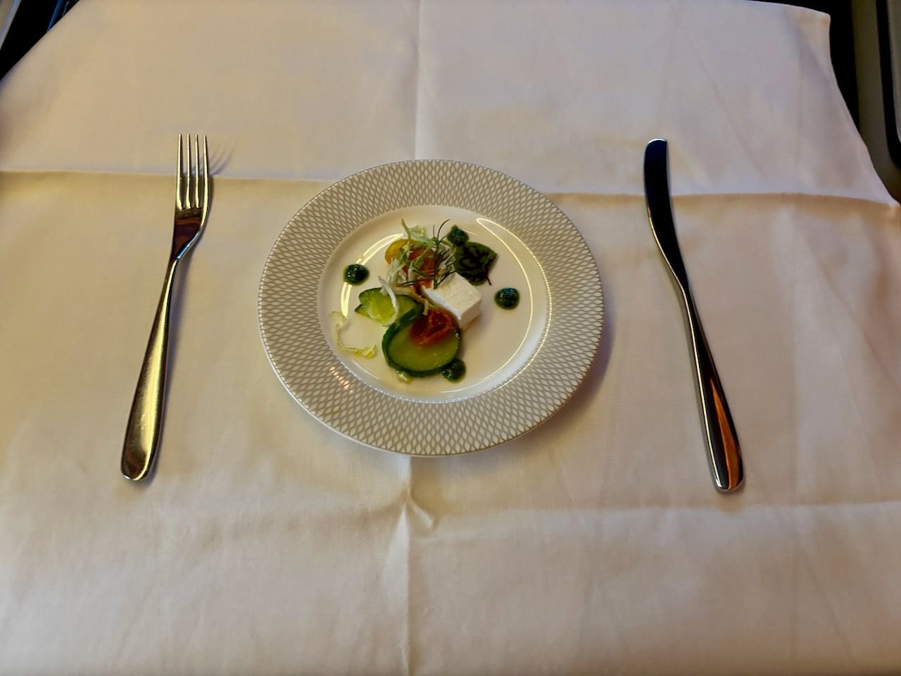 Amuse Bouche / Isle of Wight tomatoes, manouri cheese, mustard pickled cucumber, wild rocket pesto