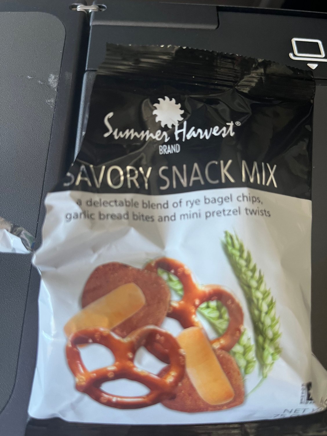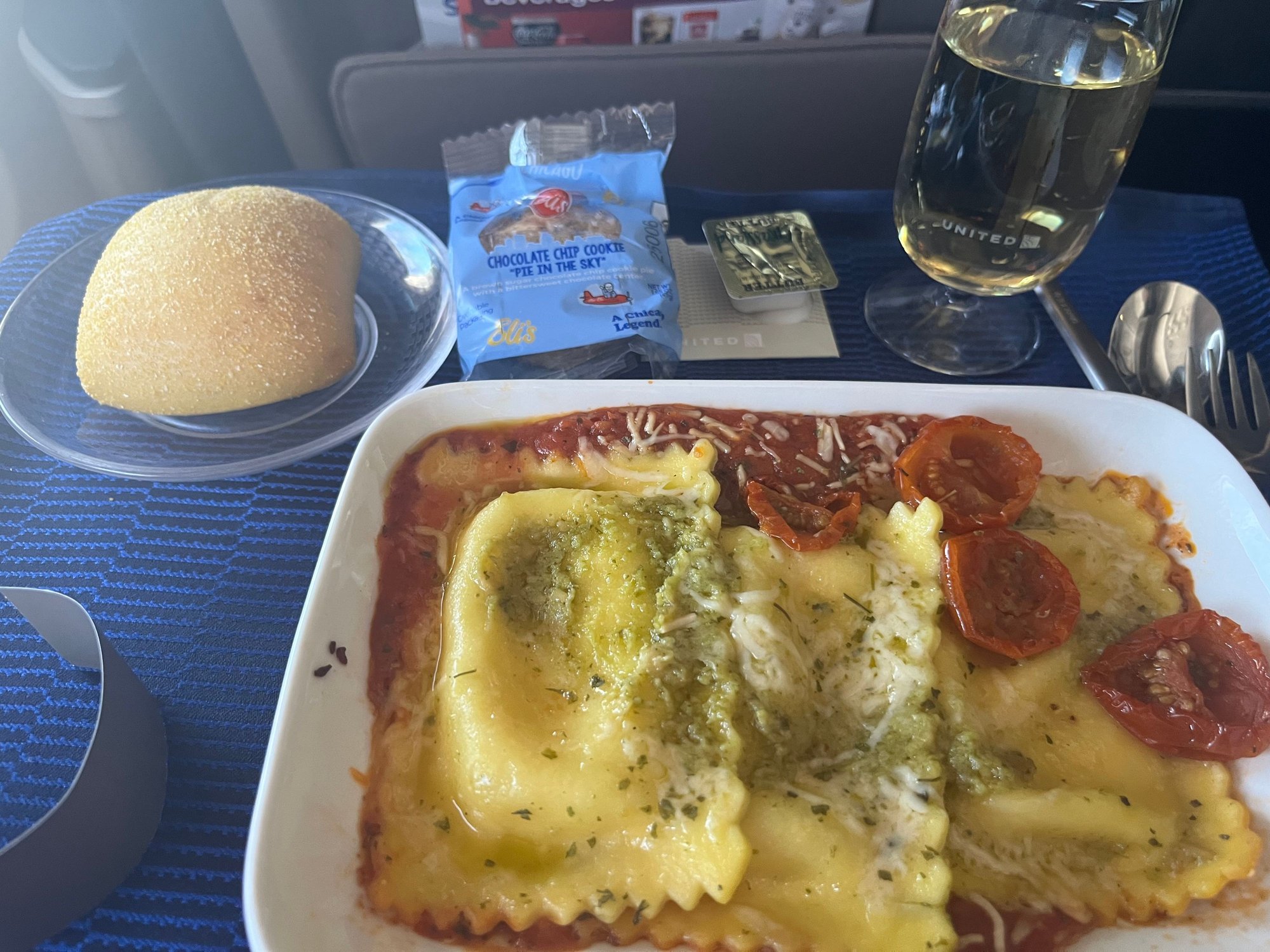 The very nice FA asked if I would like a glass of two buck chuck with my snack mix and I gladly accepted. It was delivered with my meal - which was a choice of ravioli with mystery filling or beef enchilada - I chose the Ravioli and honestly it wasn’t that bad at all - and I was able to use the superheated plate to melt the frozen butter for my stale roll!