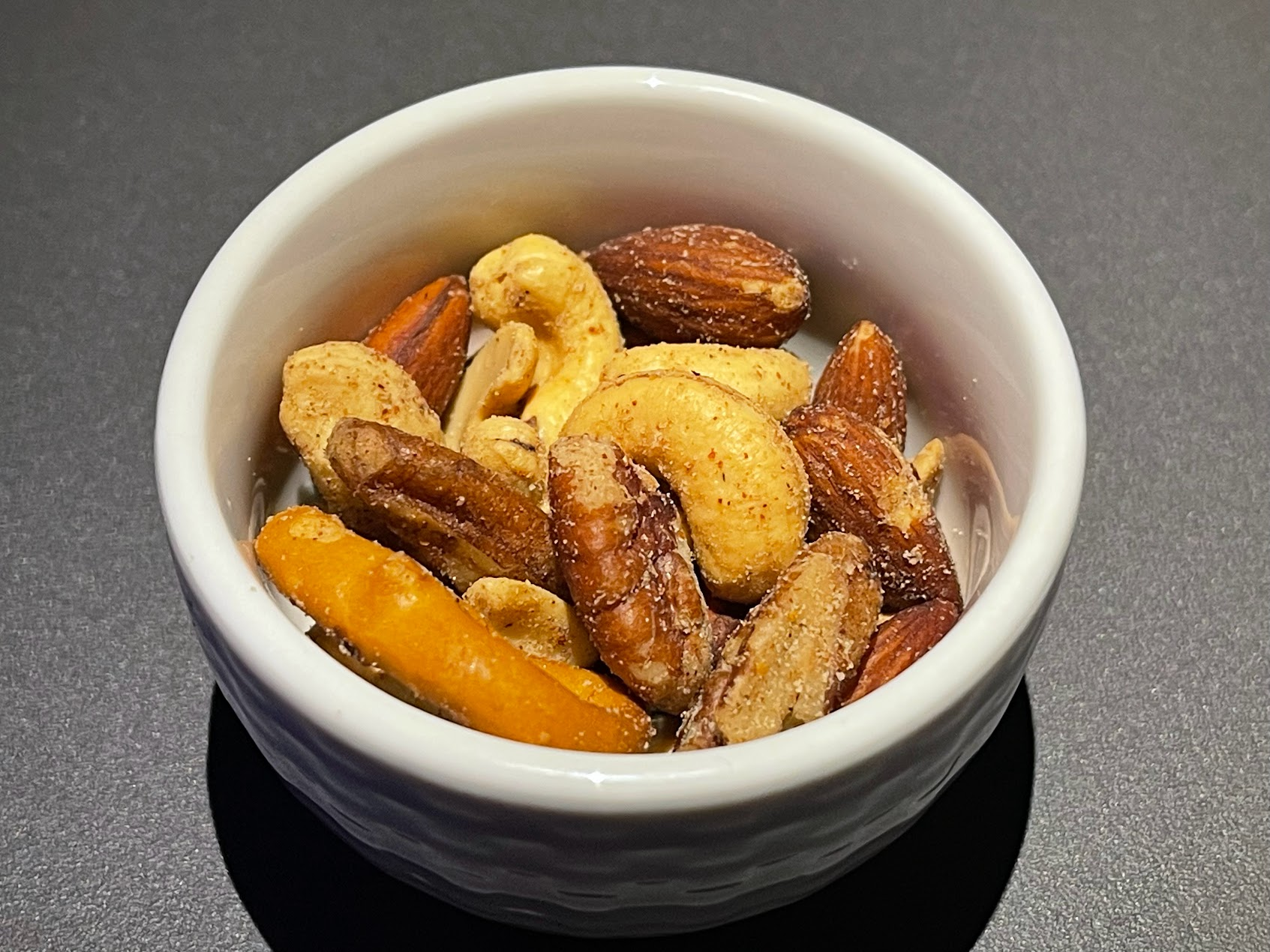 Nuts - nice and warm, fresh, crisp, and heavily seasoned. Two pretzels, alas.