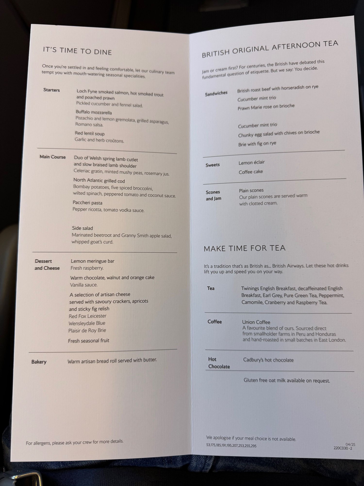 Menu from the LHR-MIA BA207 (as well as 53, 175, 185, 191, 195, 253, 255, & 295)