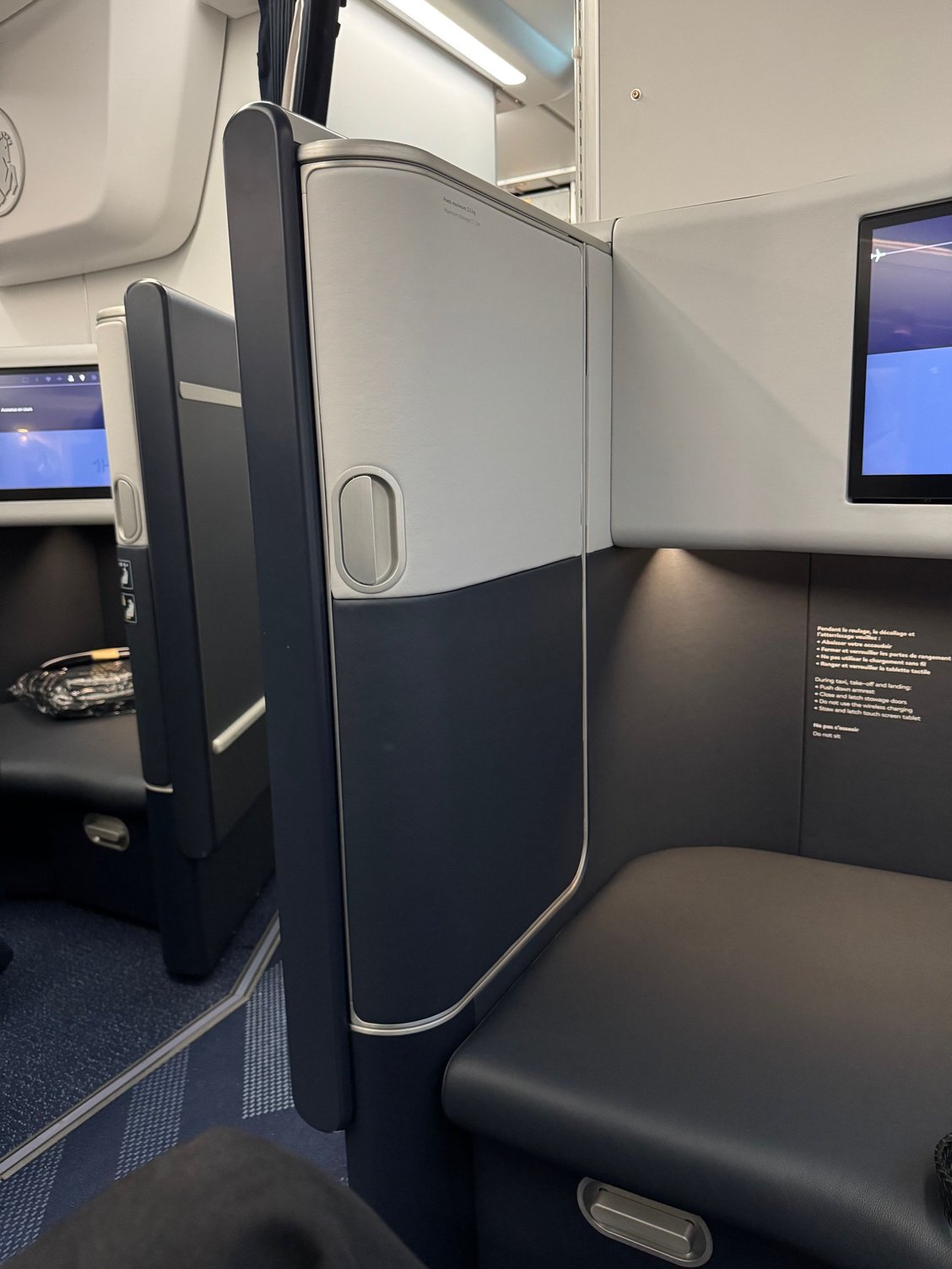 Here two pictures from last week in 1L. I'm a normal size adult even if in that picture it looks like I am child size, and the picture of the wall divide is to show the closet compartment for the seats in that row (opens to reveal a large mirror, light, and a hook where you can hang your own jacket and store it without having to give it to the crew to store at the front). These are great seats.