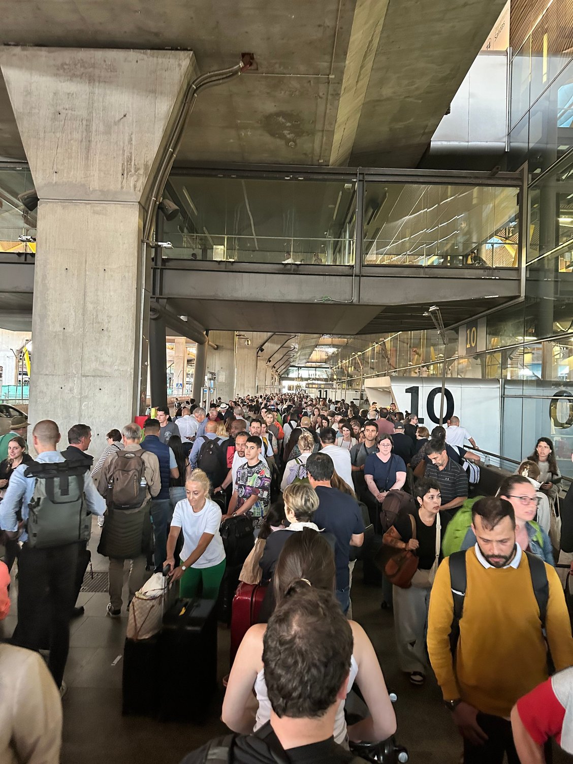 The Spanish crowds were pretty civil in standing in line and waiting for people to sort them out. All of the lines in the terminal were huge and like every airport they’re clearly under staff to deal with any of these unexpected emergencies. There was back up power and some level of lighting in the terminals. There were more than the normal number of police on the ground.