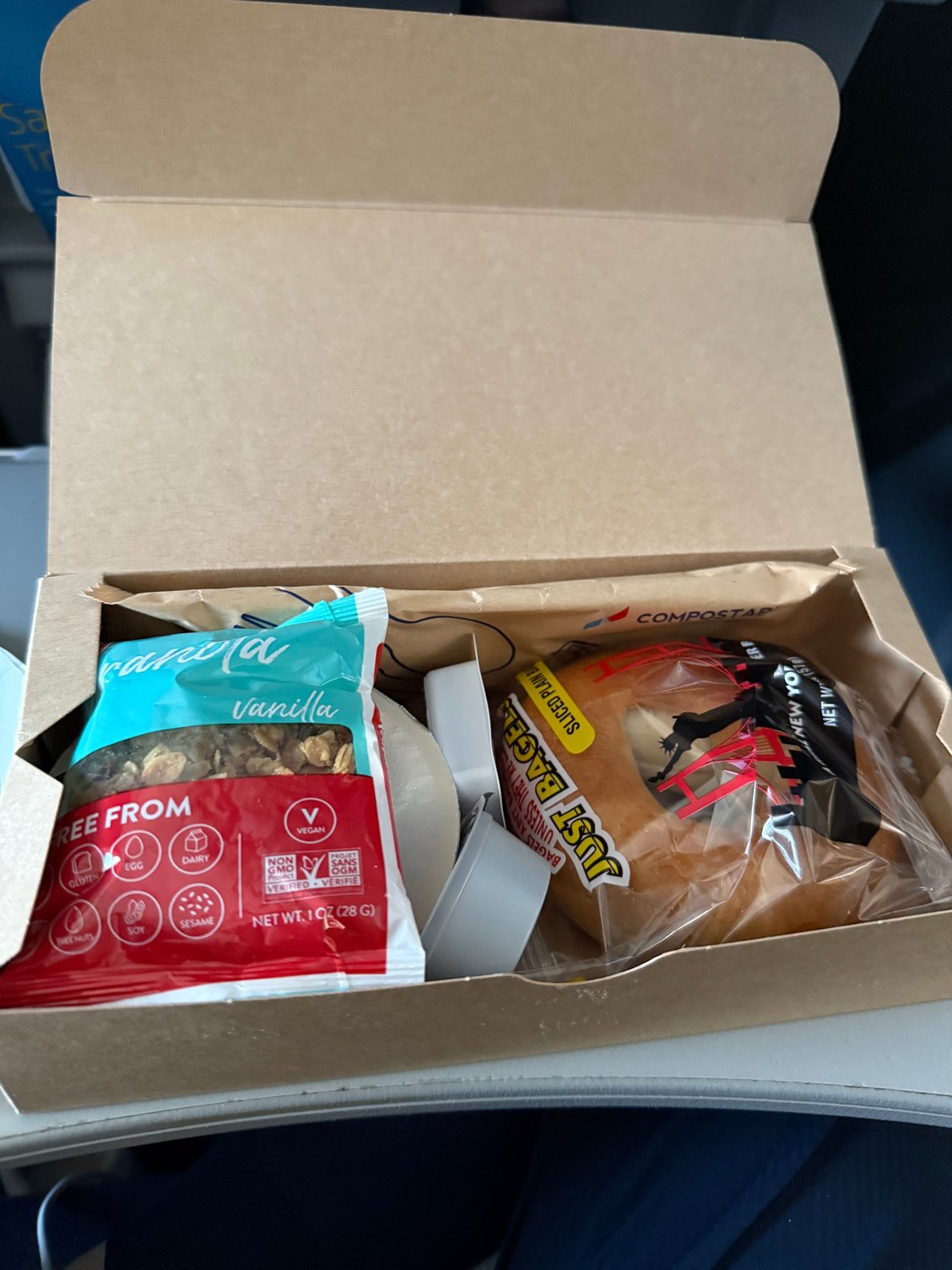 Didn’t upgrade on the route back, but economy was offered complimentary snack boxes. Chose the Bagel with chobani+granola. There were two other options (a chia oatmeal and the other one looked like a savory hot option). Not the greatest, thankfully I already ate at the lounge prior.