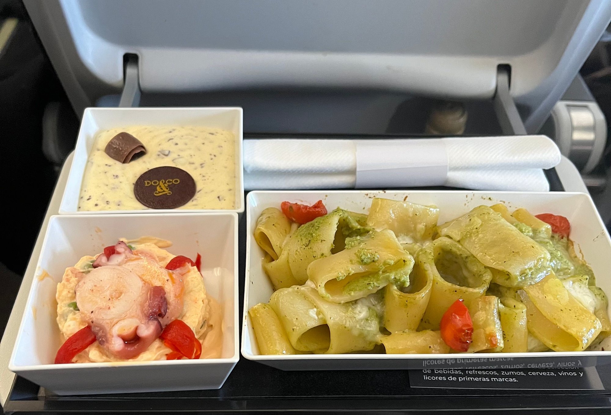 Potato salad with slices of octopus, pasta with a pesto sauce/mozarella/roasted cherry tomatoes, mousse with chocolate bits in. Not pictured were warm bread roll and a mini bottle of cava
