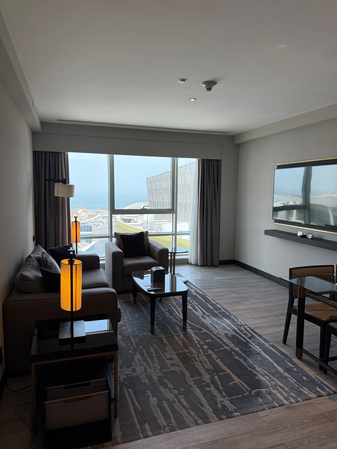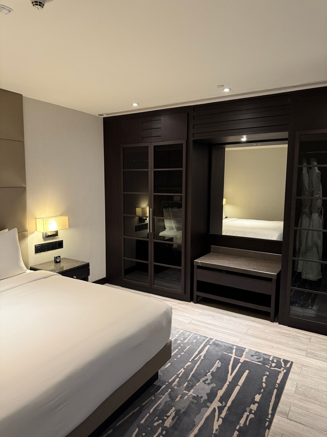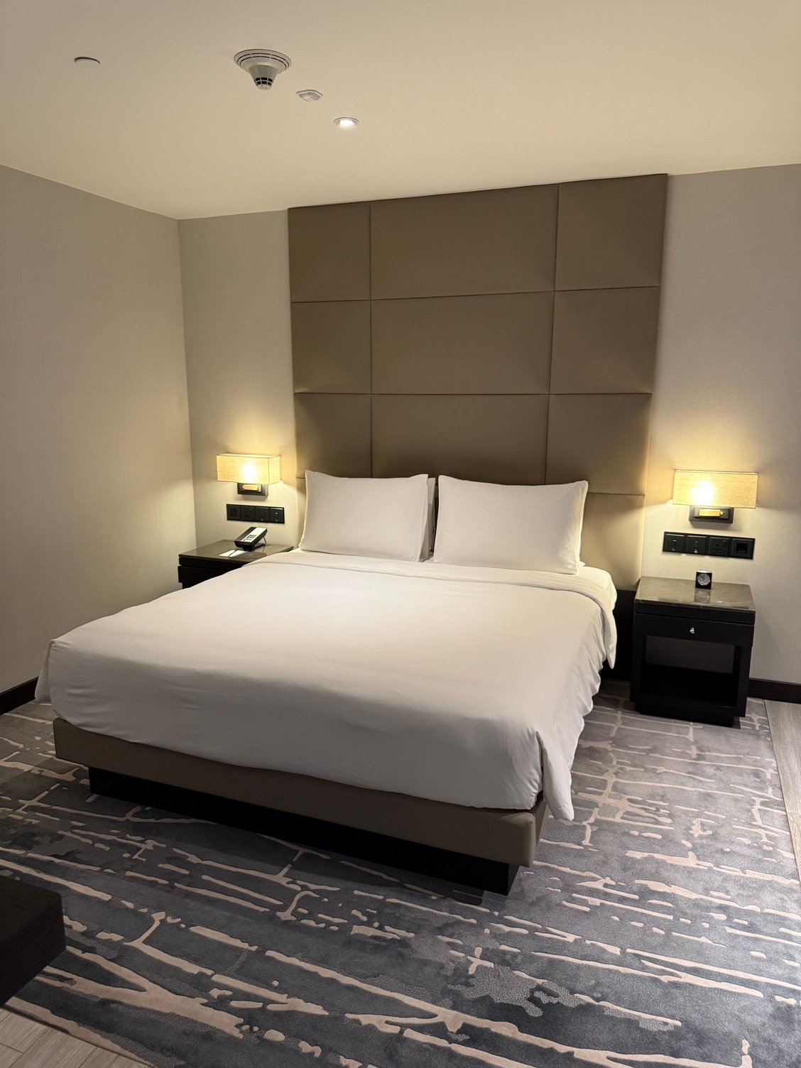 - Bed was comfortable - medium mattress, plush pillows, covers not too plush but fine for Middle East climate