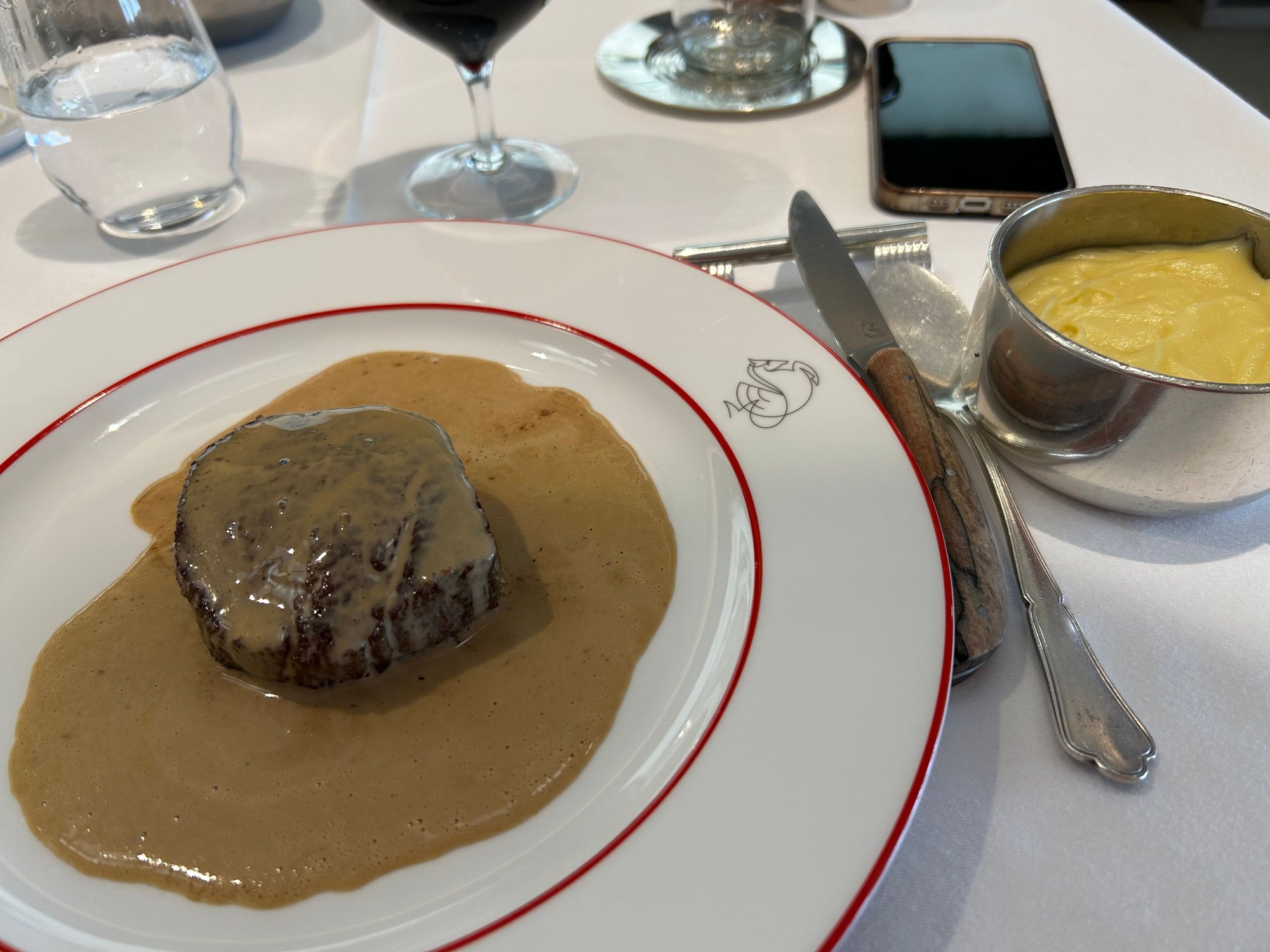 Beef filet sauce au poivre, purée