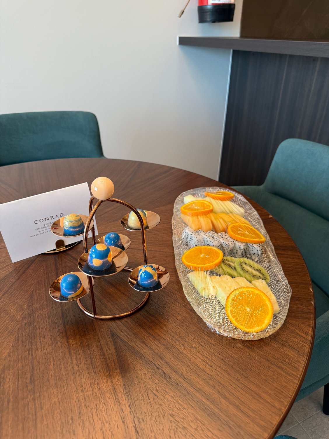 - Yummy chocolates and sliced fruits in welcome gift