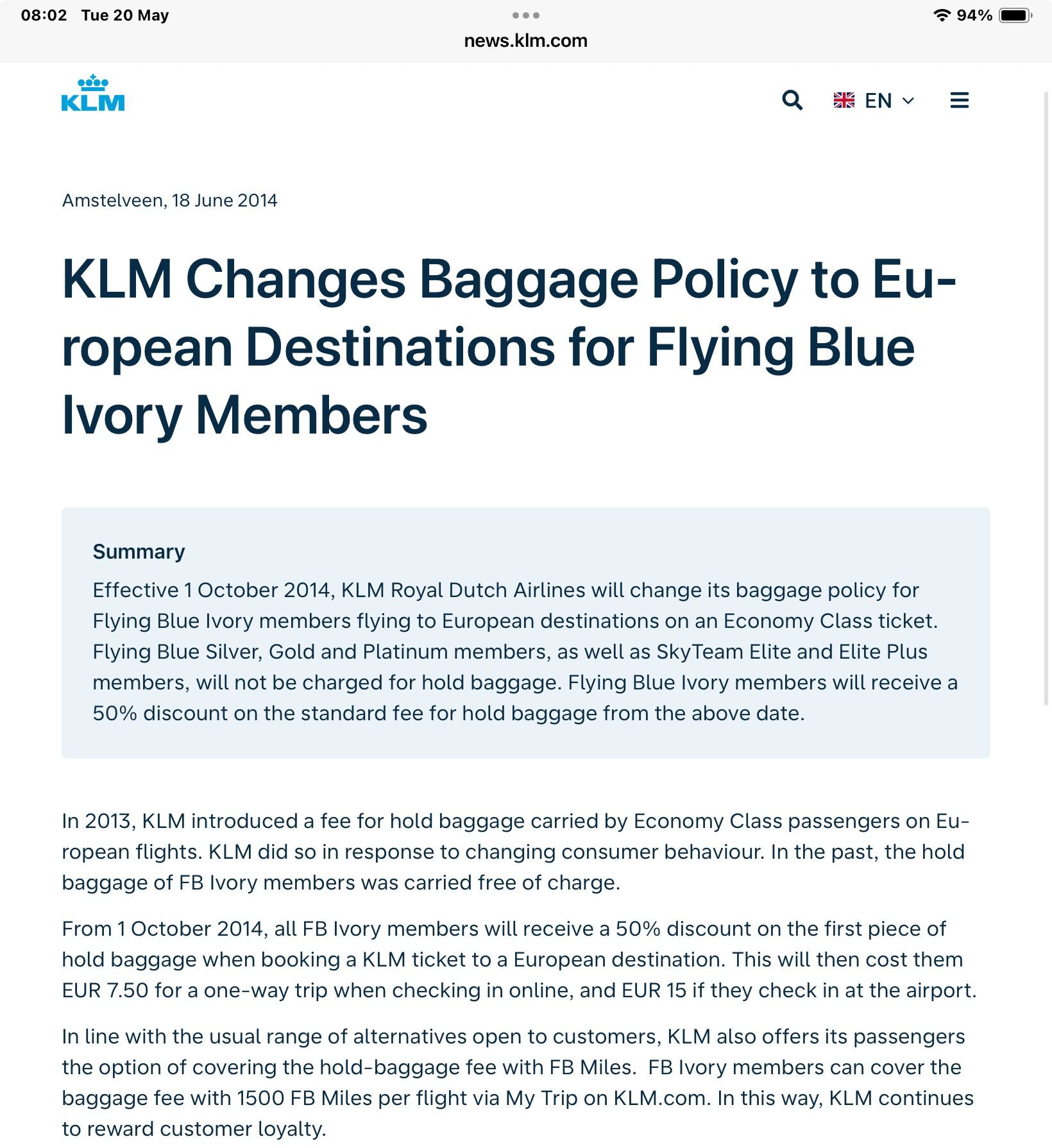 * remember the shrewd ploy < 2014 to get people to sign up for Flying Blue : als Ivory member you were guaranteed 1x 20kg check in for free , slu move to get started on datamining.