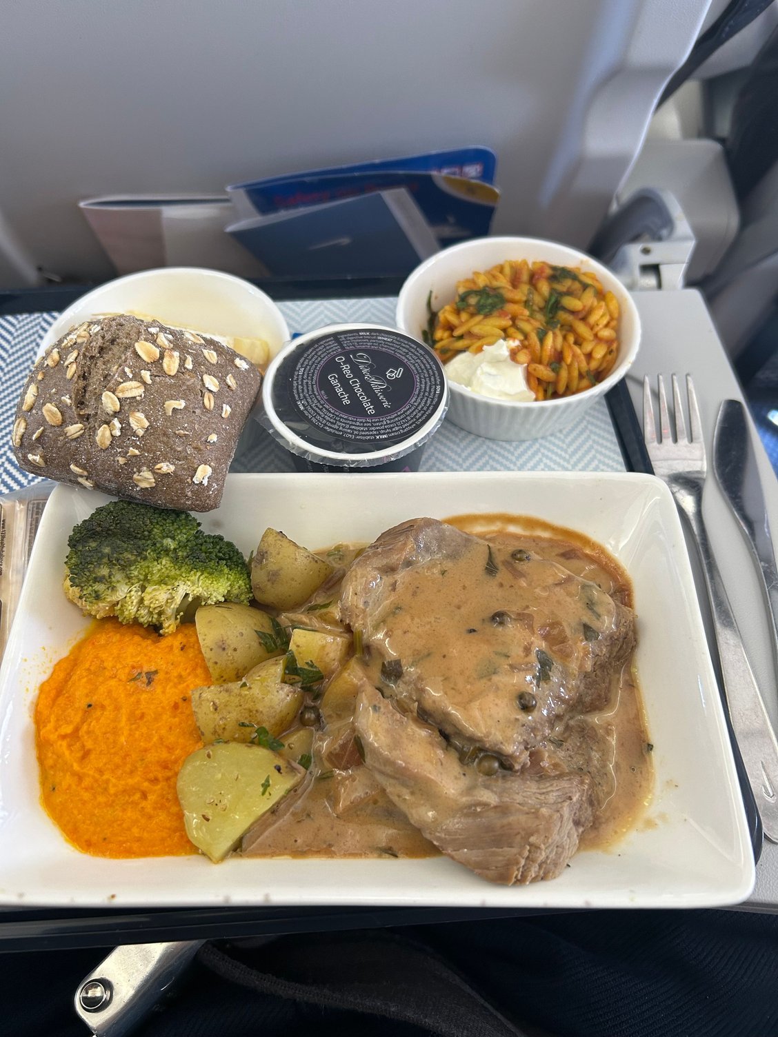 I think the chicken had run out by row 4. We were row 8 (of 8), and I opted for the beef. Orzo salad was unremarkable - too cold to have much flavour. Beef was tasty although needed the peppercorn sauce as it was quite dry. My dessert was duly stolen by daughter no. 2 who reported it to be delicious.