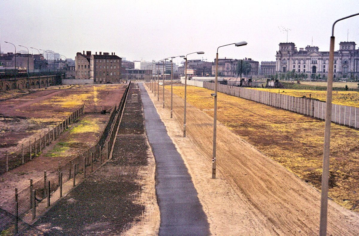 The wall was more than a wall in most areas; it was part of a no-man's-land that included wire fences, sand strips (to bog down vehicles) and other barriers. Note the ruined Reichstag in the distance. This was taken from the Ost-West Express train (Hook of Holland to Moscow.)