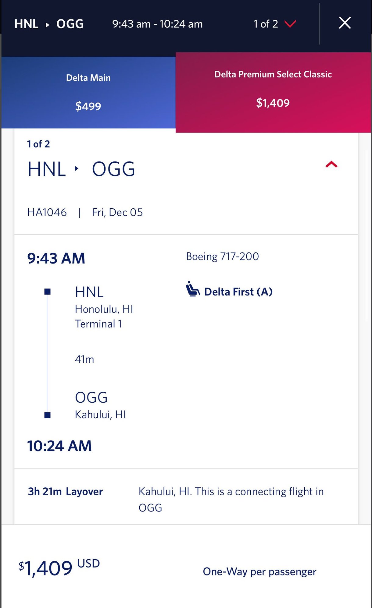 This was also an interesting data point: for an HNL-OGG-LAX routing booked as Premium Select, LIH-OGG on HA booked into First Class: