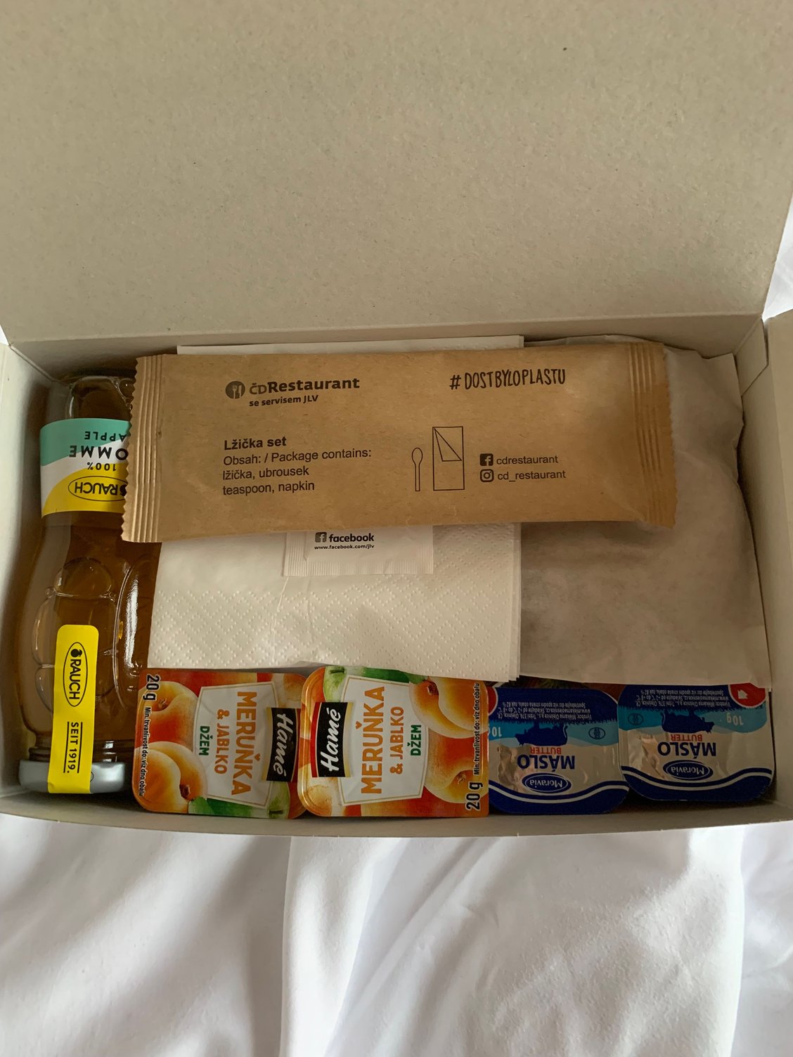 Contents: 2 bread rolls, jam, butter, apple juice and a wafer. Coffee was also provided and was decent.