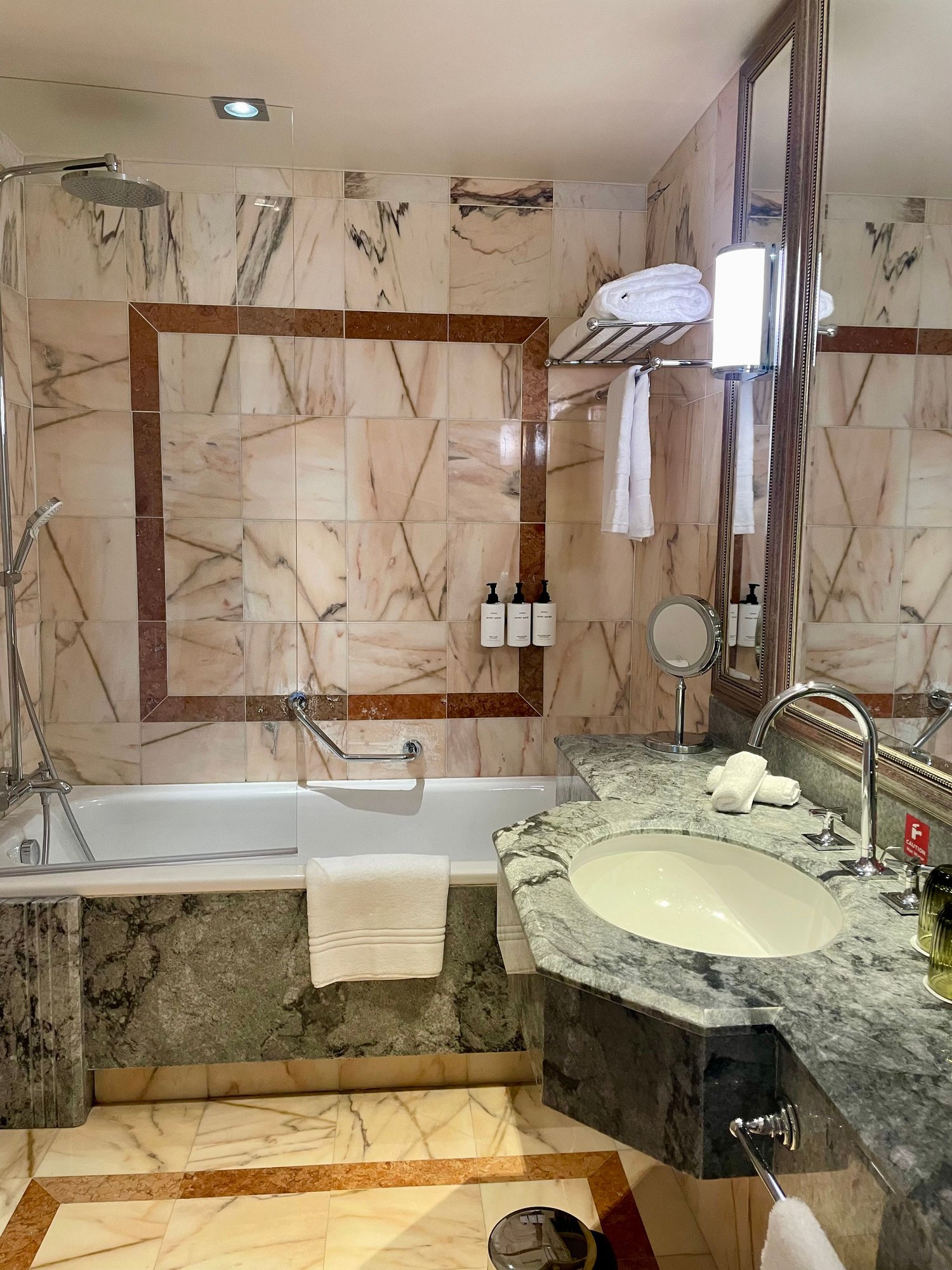 Marble bathroom with shower/bathtub combo.