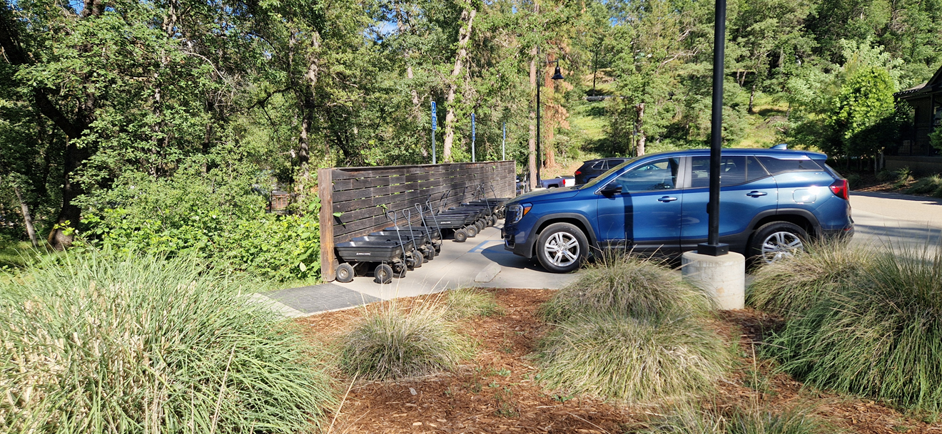 At the entrance, there’s a small turnaround area—that’s where the YARTS bus stops. It only comes by at this stop twice a day and requires an online reservation in advance.