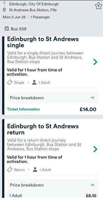 You may also want to look at ticket types. An East of Scotland Dayrider will be cheaper than a regular single fare and allows you to use other Stagecoach services if you require them. And one I hadn't come across before, check the price of a return even if you don't plan to use it.