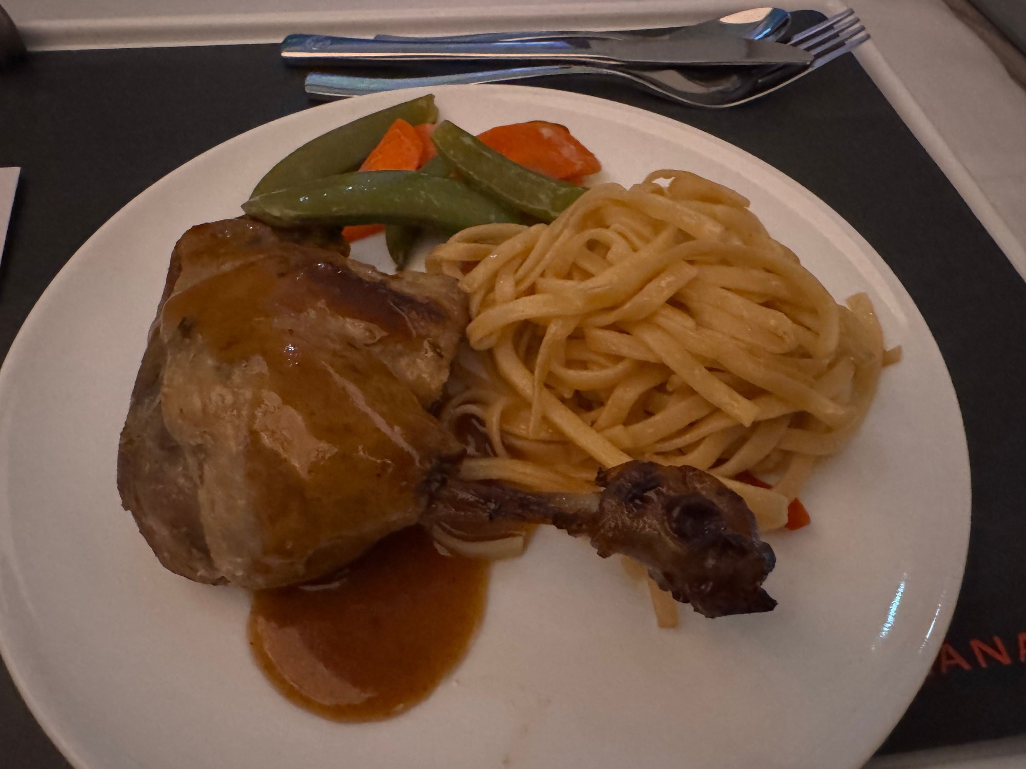 Yes! I had it on Sunday night, YUL-BRU. Picture below. I’m generally fond of duck, particularly confit, and I liked this well enough. The thin layer of fat added to the flavour. It probably could have been warmed a little more but that’ll surely vary. The noodles and veggies weren’t terribly inspired, but I didn’t really care as long as the duck was nice. Would have again.