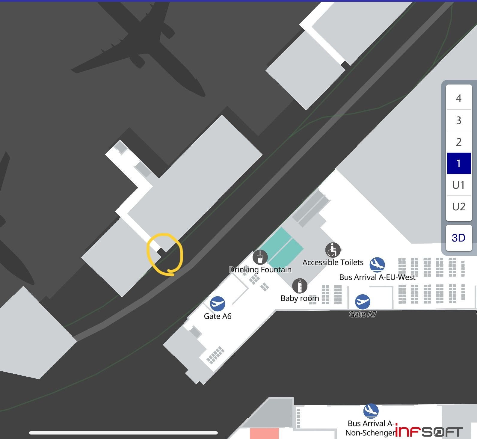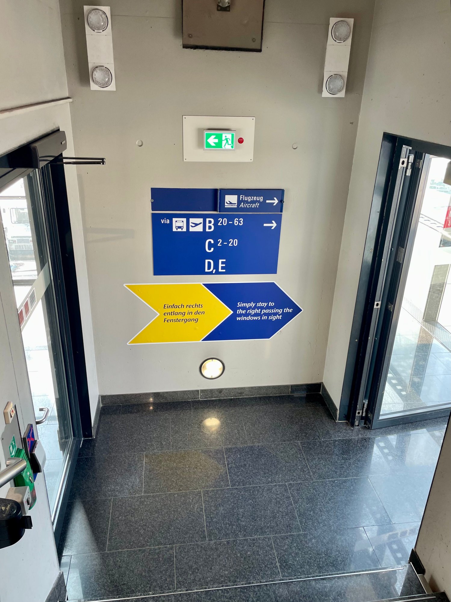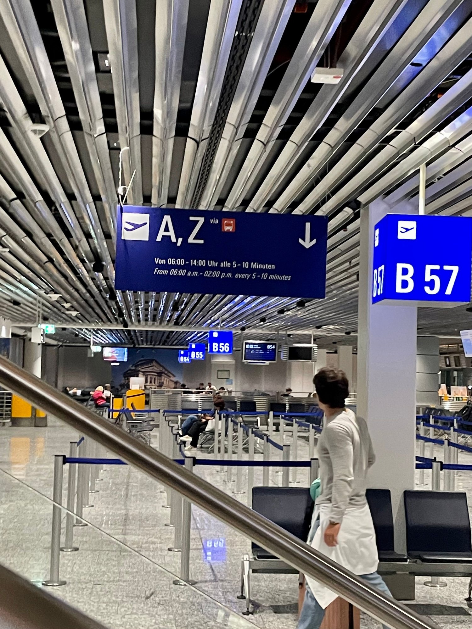My transfer bus arrived at gate B57 where there are escalators (and an elevator although I didn’t see it) to take passengers up to B departures near Goethe Bar and gates B30-B33. Transfer buses to Z leave from the same B54-B57 area every 5-10 minutes between 6am and 2pm according to the sign. I assume transfer buses arrive at AEUW in A/Z but perhaps someone can confirm?