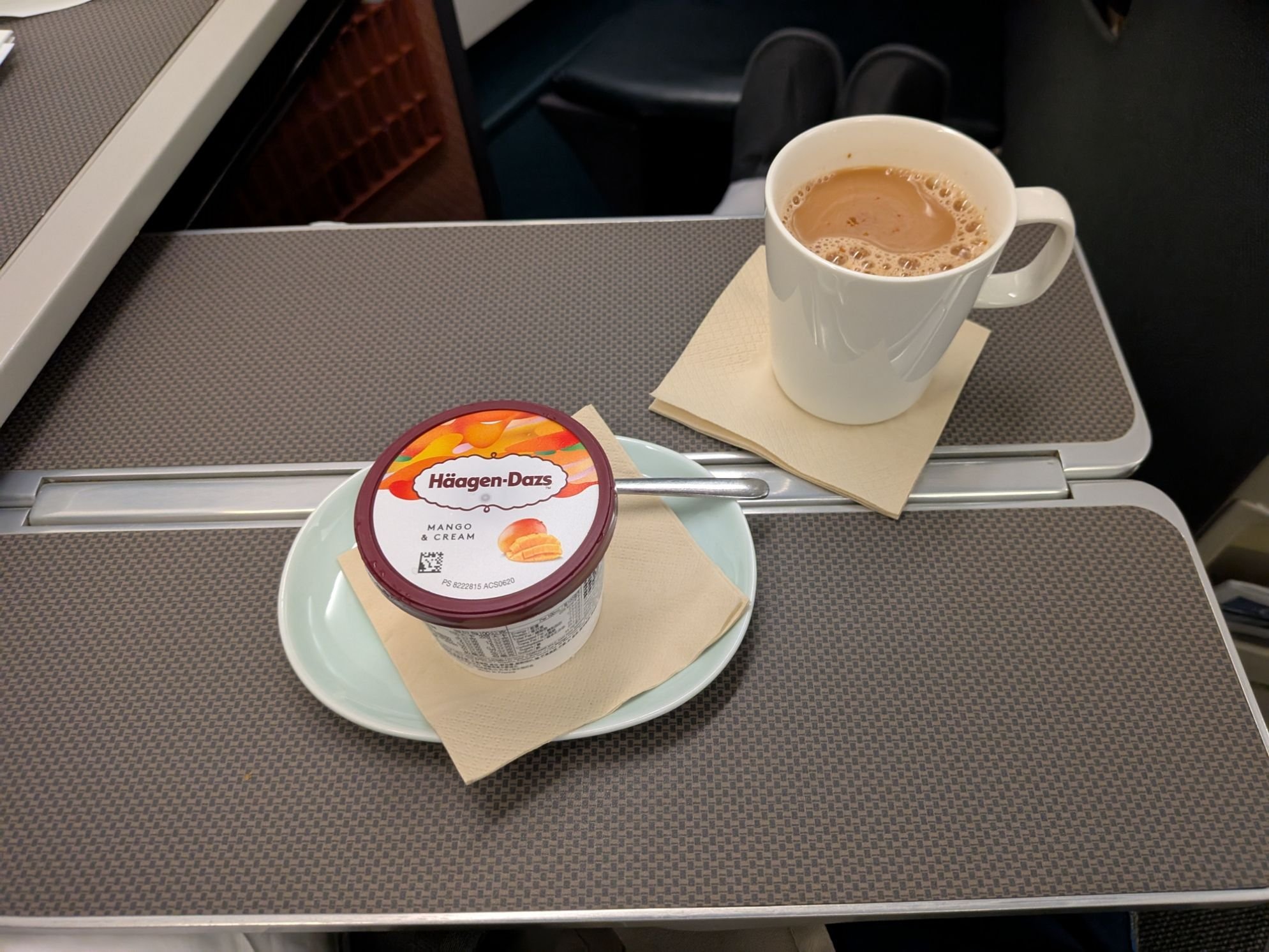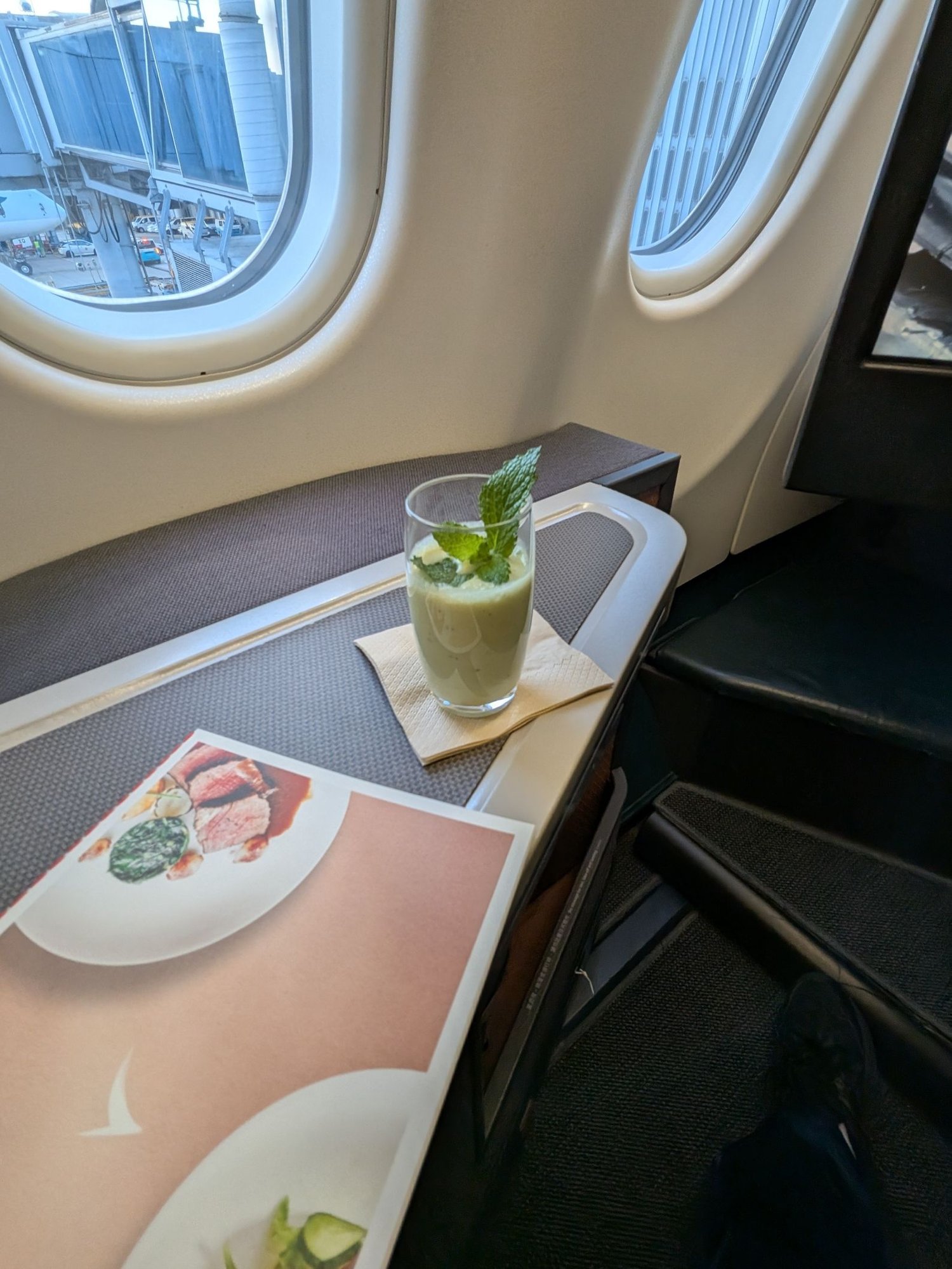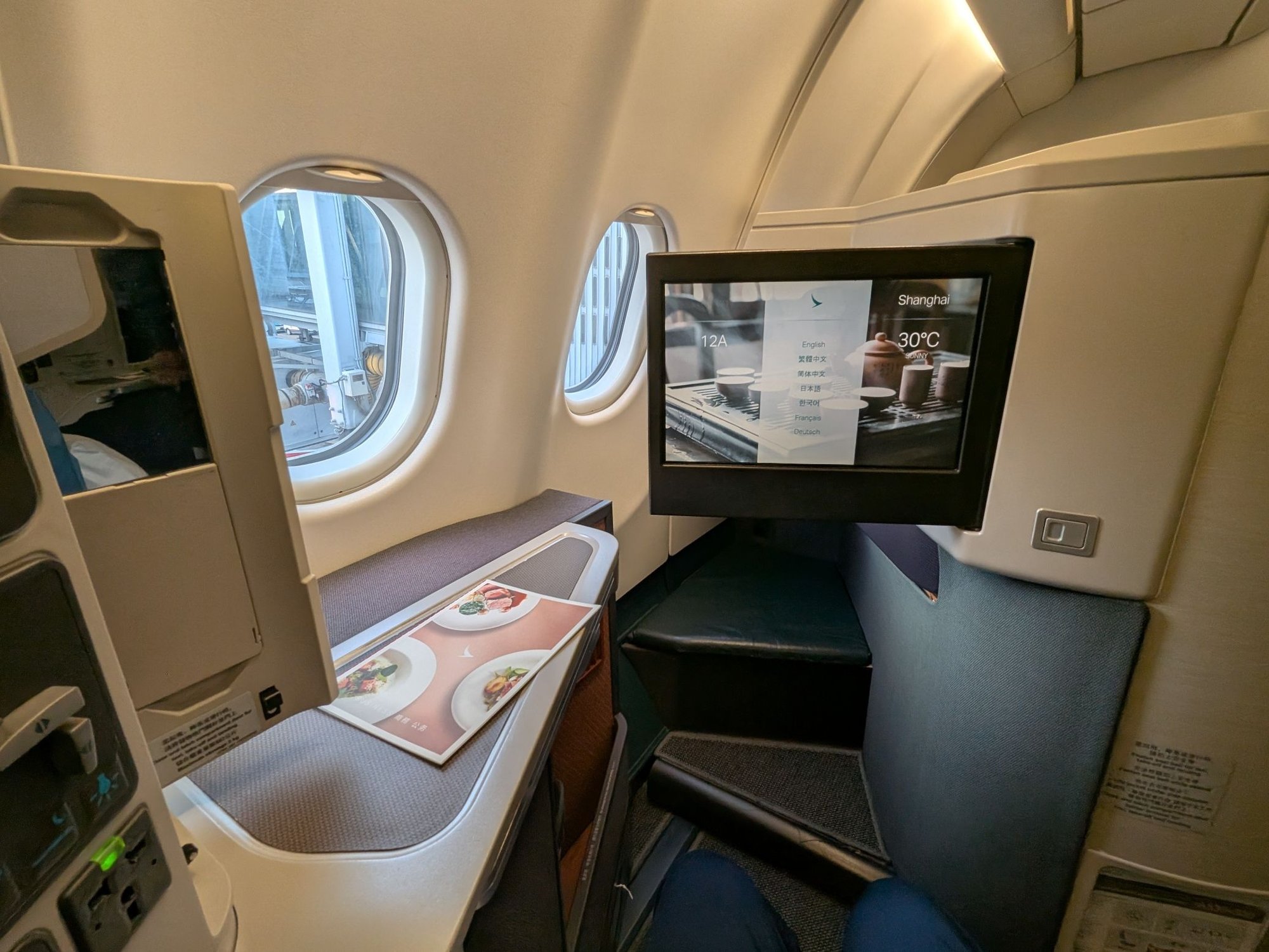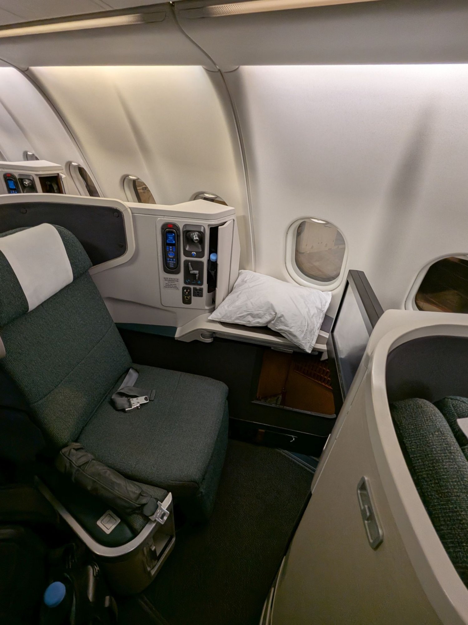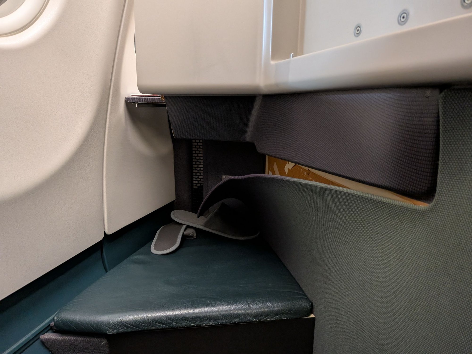 Holy crap that footwell is massive. I see what people say about Cathay having amazing reverse herringbone seats, especially as early on as they introduced this product. The only real complaint is the lack of storage; I had to put my backpack in the overhead bin for takeoff. Otherwise, this is still a phenomenal seat for sleeping, even after all these decades.