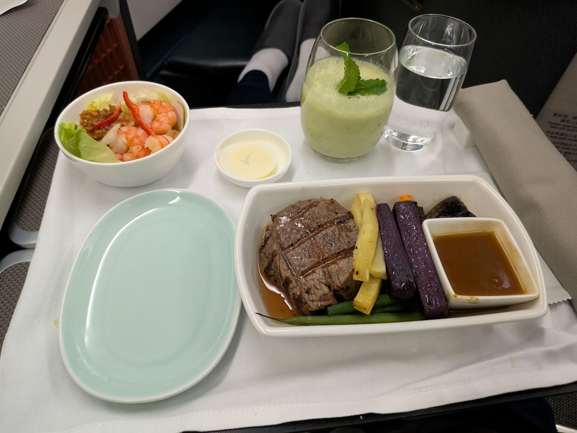 For dinner, I chose the beef option. It was very mediocre. The vegetables were oily and too sweet. The beef itself was fairly dry and lacked in flavor on its own, though the gravy helped a lot. The shrimp salad was frankly disgusting. It didn't help that I wasn't too hungry, having eaten in the lounge.