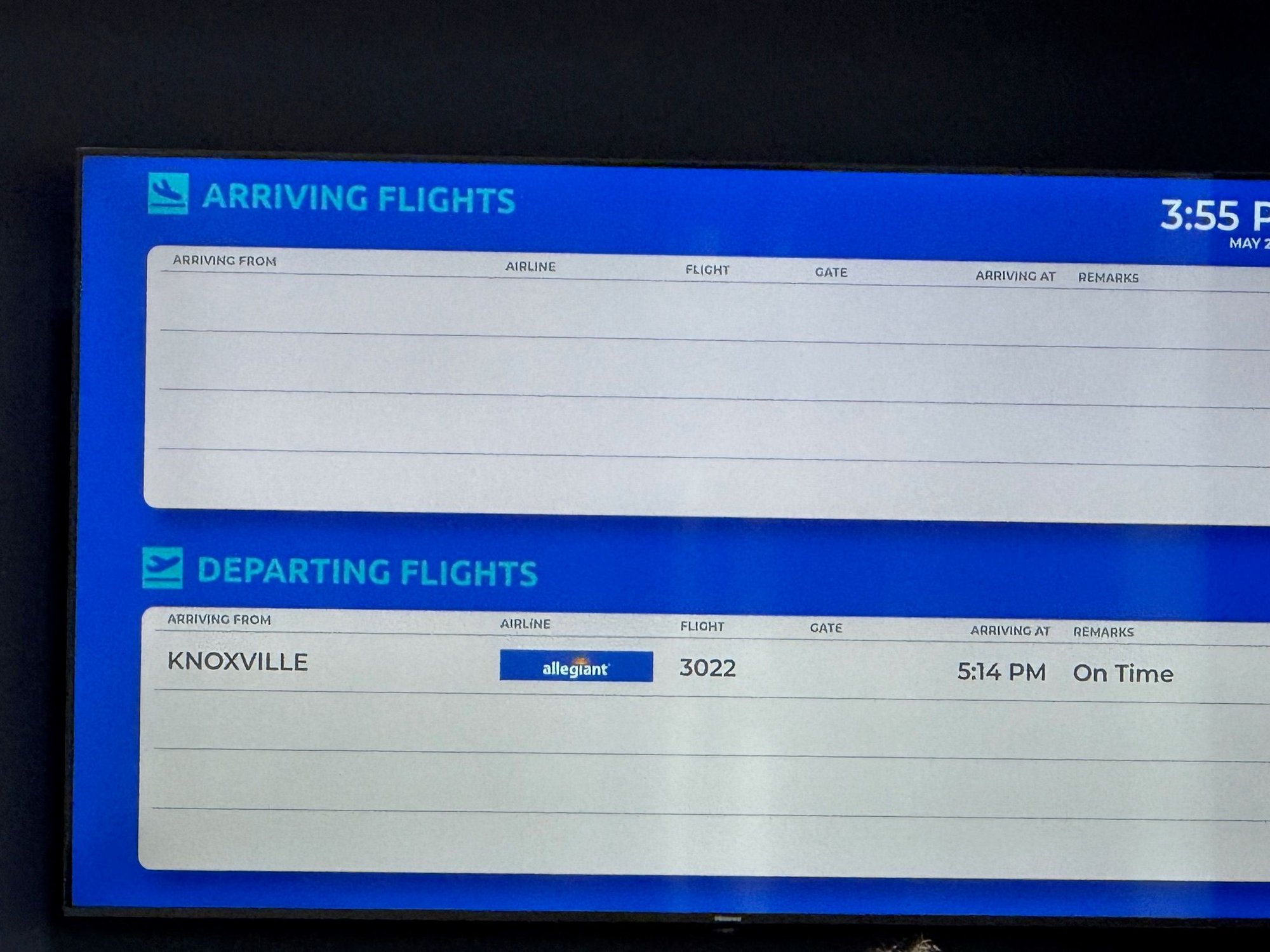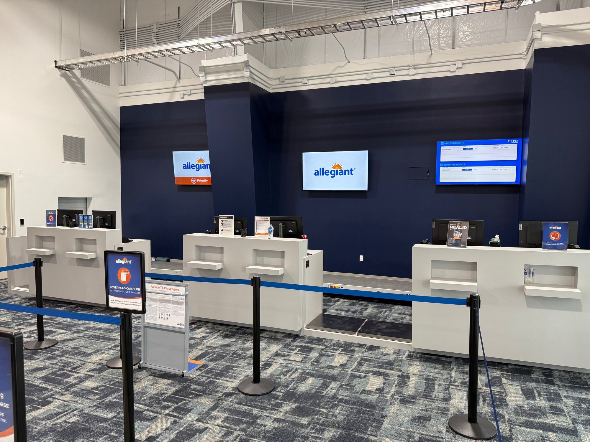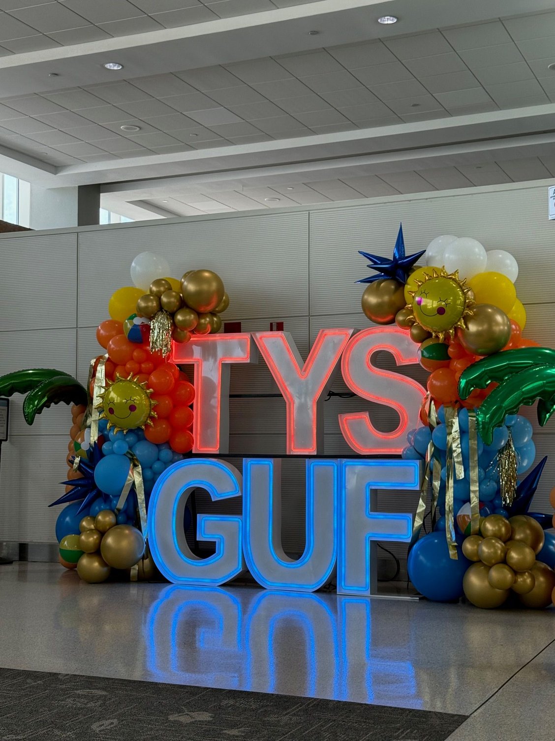 PreCheck line had several minutes of no movement even being the 3rd and 4th in line as someone at the TDC podium needed a Supervisor (and was holding a Real ID flier) and the officer wouldn’t let anybody else up until that was resolved. Then two people without PreCheck in front, one of whom was explaining to the other that it’s fine if you don’t have PreCheck, they’ll just let you go at the front of the regular line. And they got their way, which is annoying. I didn’t need to look which gate was ours once through as I looked to the left past Ruby Tuesday and saw the first gate on the right had balloons and an inflatable palm tree sticking into the circulation space. Oh yes, this is TYS who has plenty of air service marketing money. Some airport maintenance types were rolling up a podium and setting up some tables just outside the gate. Coming into view, could see a whole display set up with “TYS GUF” letters, plenty of balloons, and someone else wheeling up a flat cart with five gallon buckets filled with bags of sand. Aircraft was already there – as TYS is a base for Allegiant, and Tues/Wed are usually light days in the schedule, several spares (did see later on at least 2 more A320s parked on a remote pad, in addition to 2 others that arrived to gates about the time we were ready to depart).