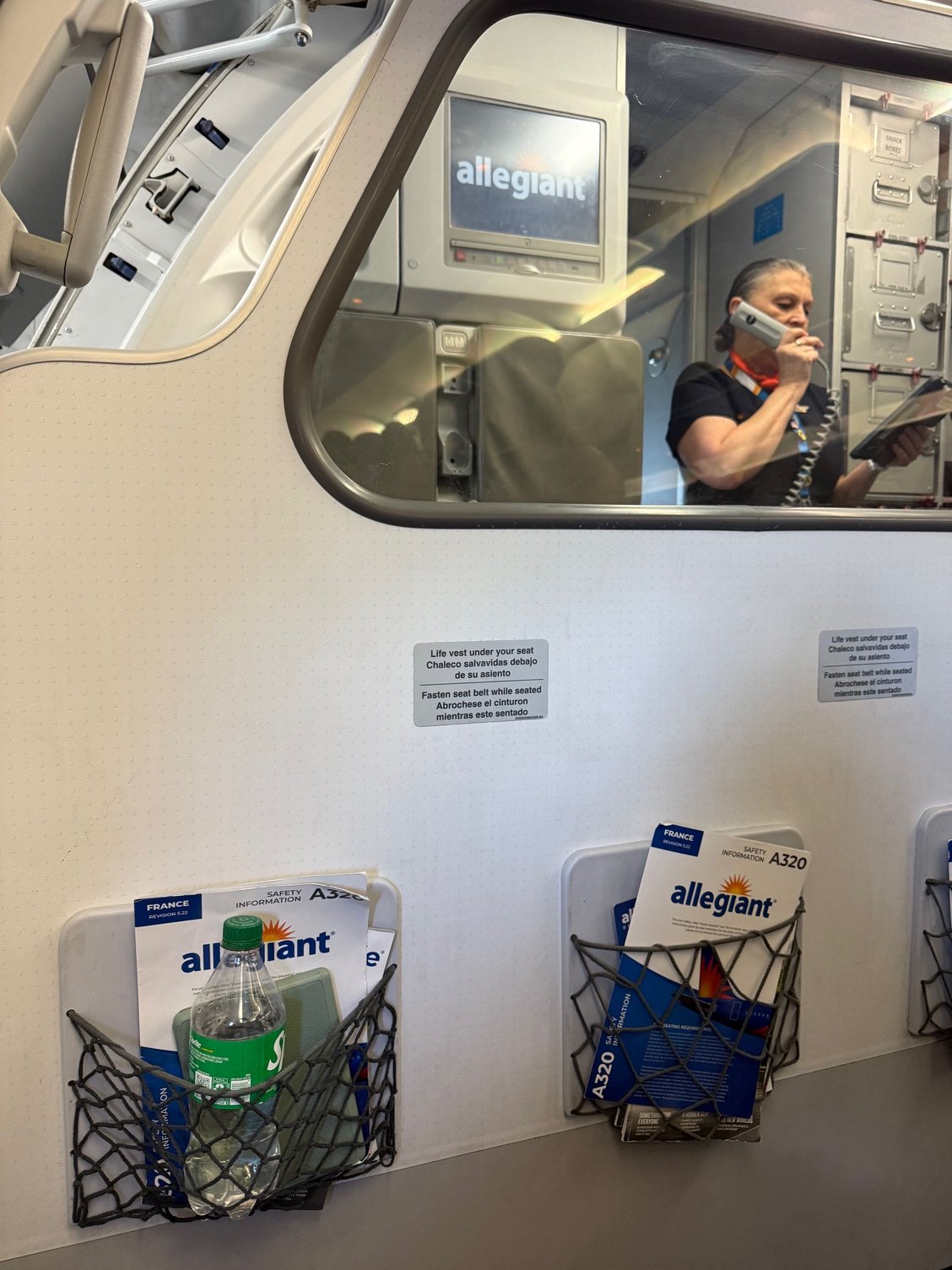 Just under an hour to departure, boarding began with Priority Boarding which is those who have the Allegiant credit card (which for a $60 annual fee comes with priority boarding/check-in line and a free drink including alcohol on each flight, which pretty much pays for itself in two round trips, which isn’t bad when you think about the $200-300 worth of points that are on the sign-up offers – probably explains why Allegiant has the highest take rate of any co-branded airline credit card in the US). We boarded and took our seats in the first row, either side window. Tons of legroom. This A320 had a fixed bulkhead in front of 1ABC which was different than the advance seatmap – some aircraft don’t have a wall and you face the flight attendants. The flight attendants had the overhead bins over the first two rows closed to protect them for bulkhead inhabitants. I put away my bag and one F/A closed it after me. She turned to my father and offered to place his bag overhead. The crew was friendly and chatty during boarding, directing people to seats, helping with bags, helping families who had small children, etc. I’ve found Allegiant crews to be on average in a far better mood than those on most airlines and far more helpful. I say that having flown Allegiant probably 40-50 times. Martina (the lead) and this TYS crew were fantastic. Allegiant crews are home nearly every single night, interact with the same set of airport agents and pilots daily, often fly together with the same people week after week (as some bases are relatively small), and I’ve noticed with the 2-3 time a week frequency on most routes, they often see the same passengers going and coming to book-end a long weekend or a week away.
