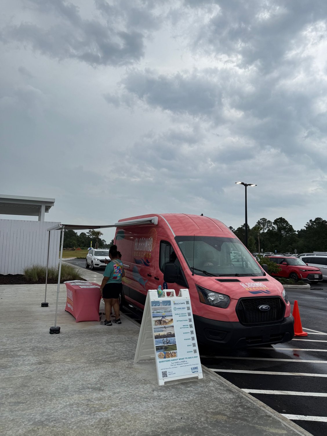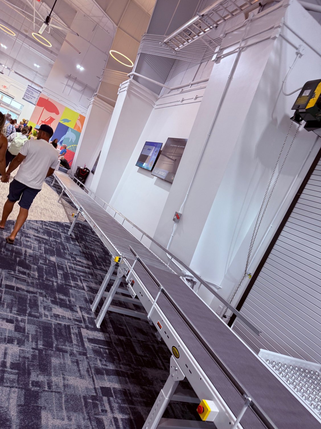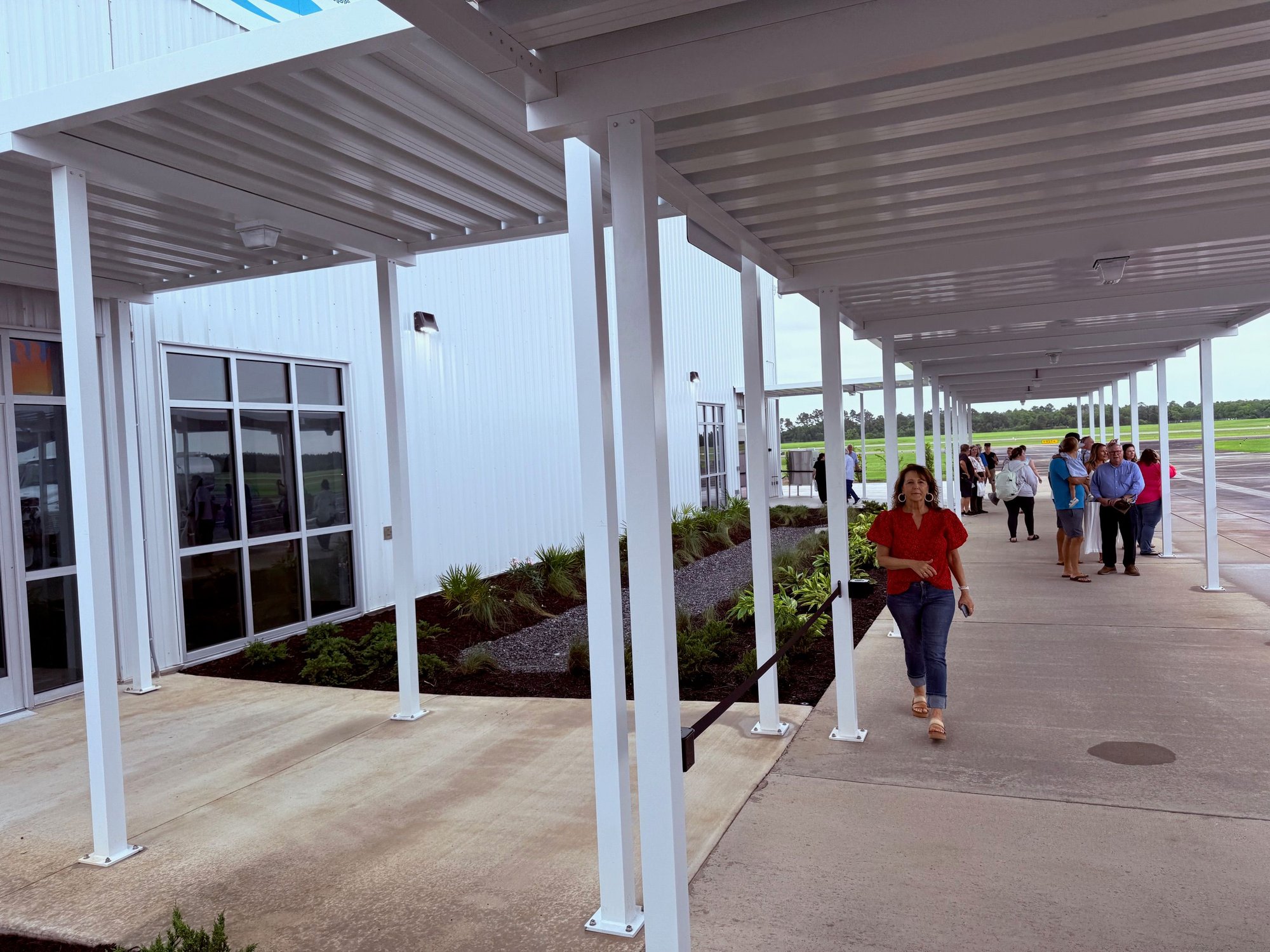 It looks like there are 2-3 parking positions perpendicular to the new terminal with a covered walkway extending out along the front of them. We walked down the walkway and to the terminal entrance which places you in baggage claim. The building smelled new – that smell of carpet glue I think mixed with fresh paint. Nicely done terminal for looking like a huge metal shed from the outside. Baggage claim was not so much a carousel but a long roller strip which should be sufficient and is a low cost way of doing things when the building is supposedly temporary. Lots and lots of people to greet inside with cold waters and local Gulf Shores swag to hand out such as hats, stickers, USB drives, etc. In the departure/check-in side of things, catering was set up with free drinks and some meat on skewers, chips and dip, etc.
