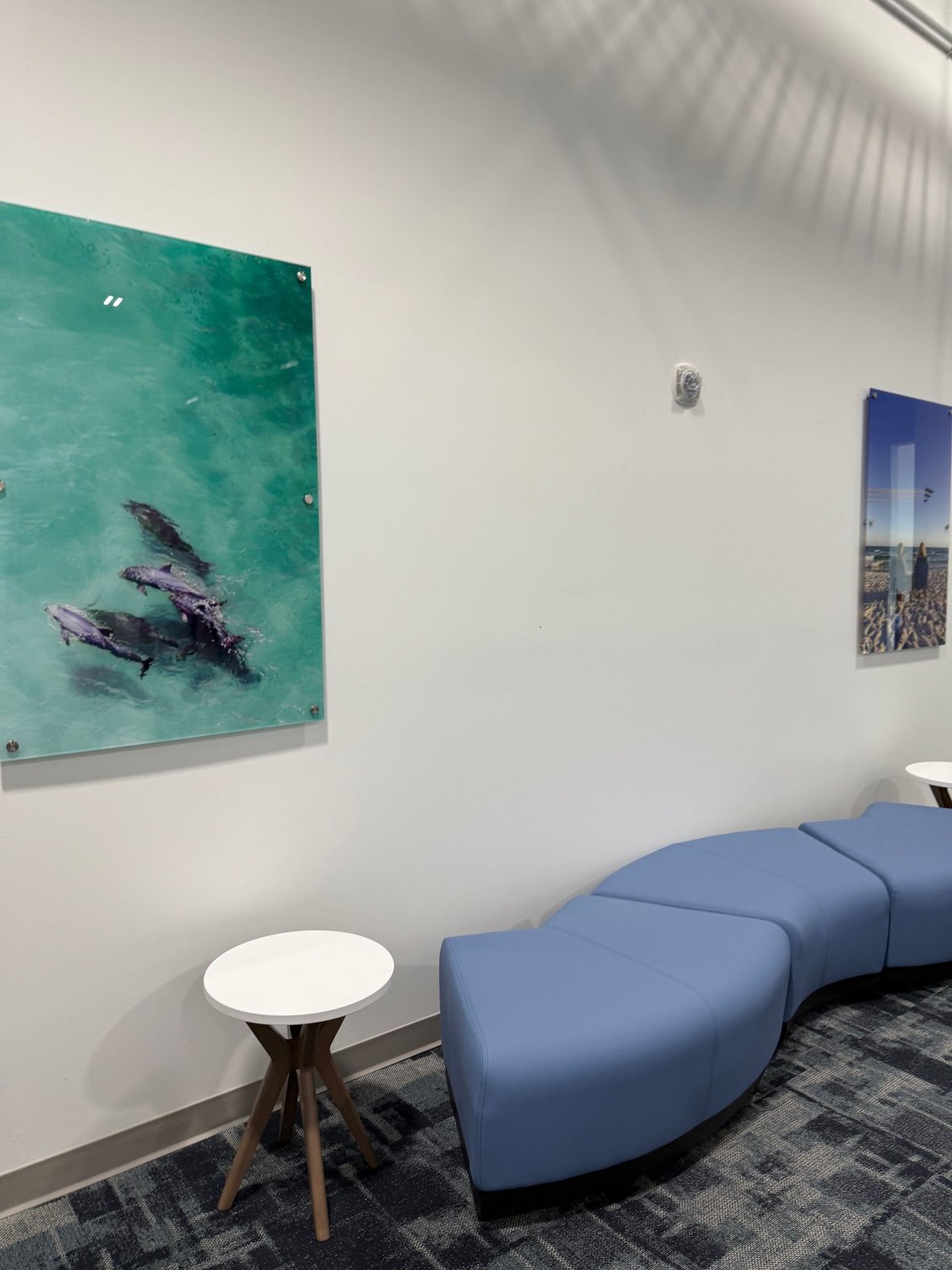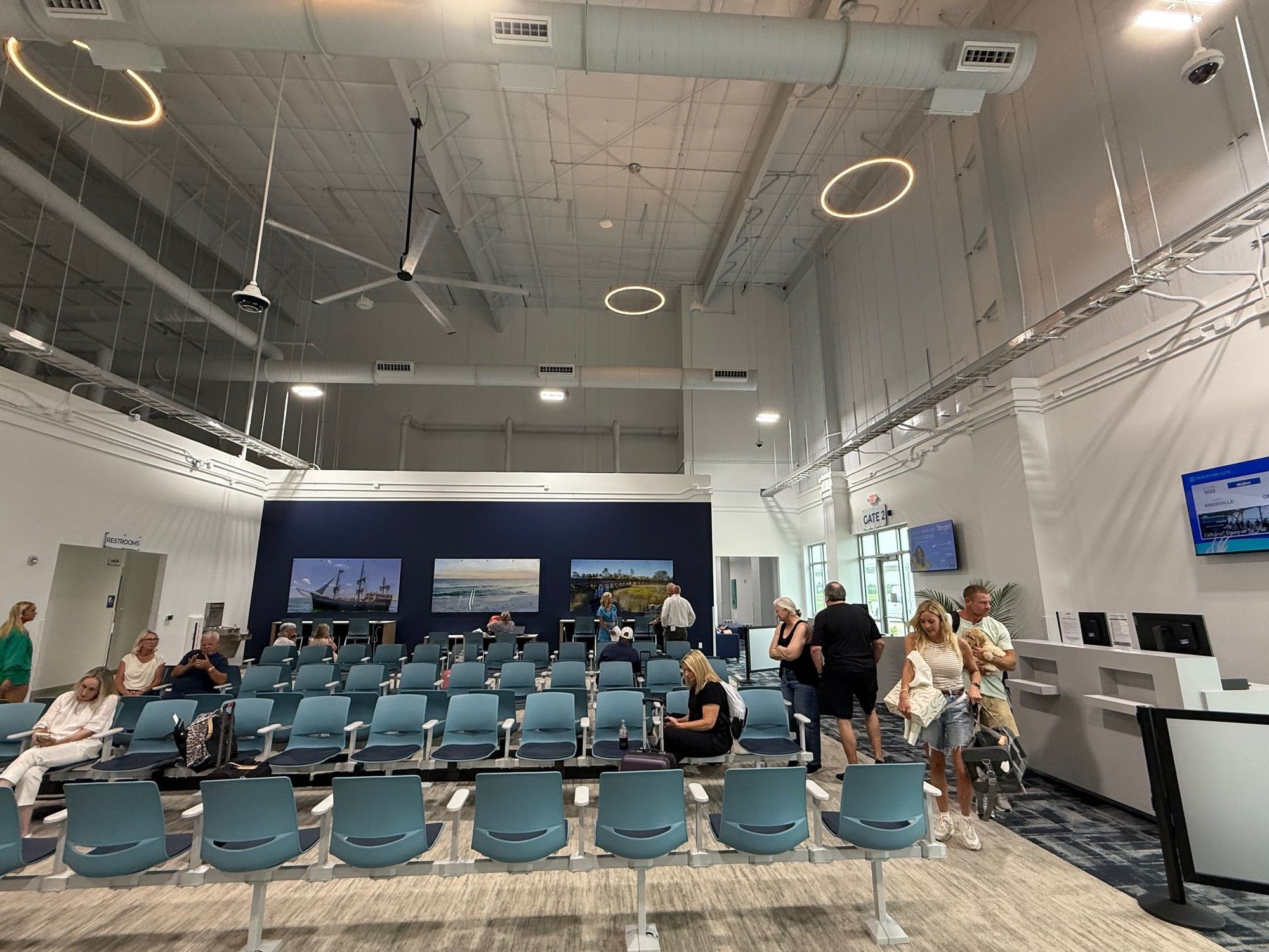 No wait at TSA and through to the secure side. There is an area immediately after TSA with some seats both in traditional hold room seats and some sofas then the larger gate area with restrooms, vending machines, and a mix of regular seating and high counter around the wall with electrical outlets. The gate area is set up with two boarding doors (Gates 1 and 2) leading to the same walkway. Restrooms were full sized which is nice as most airports of this size tend to just have a single shot (and if you’re lucky one for males and one for females) inside security. The terminal has lots of lighting that isn’t standard overhead fluorescent office-style lighting so that is much nicer. Also plenty of artwork both professional (that you could of course find artist information to buy if you wanted) and from local schools.