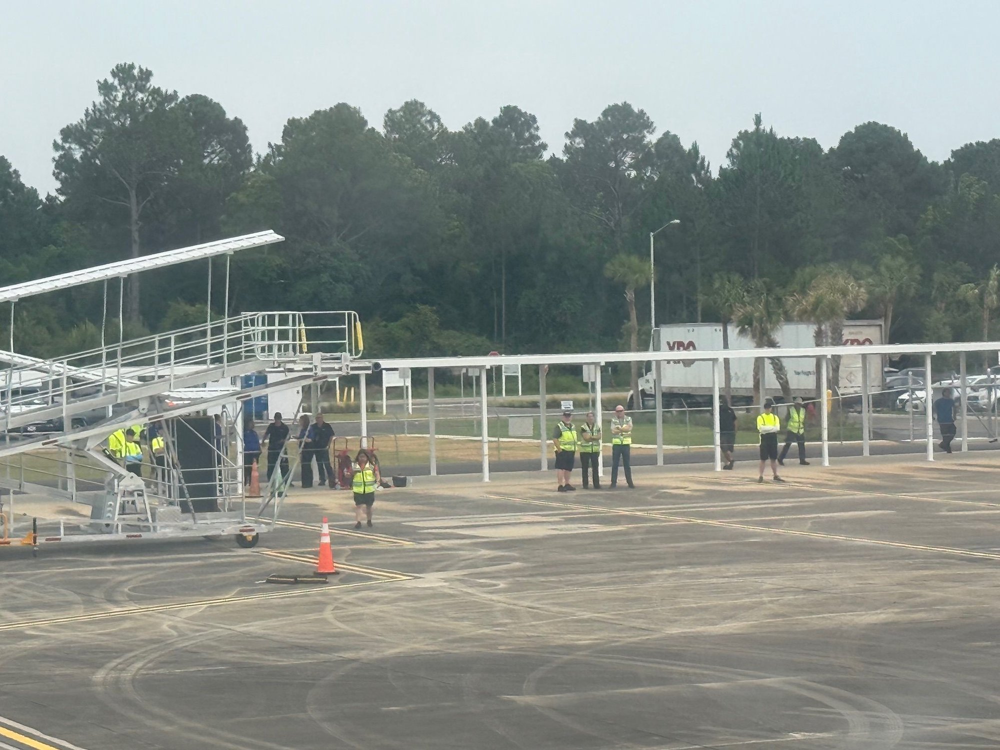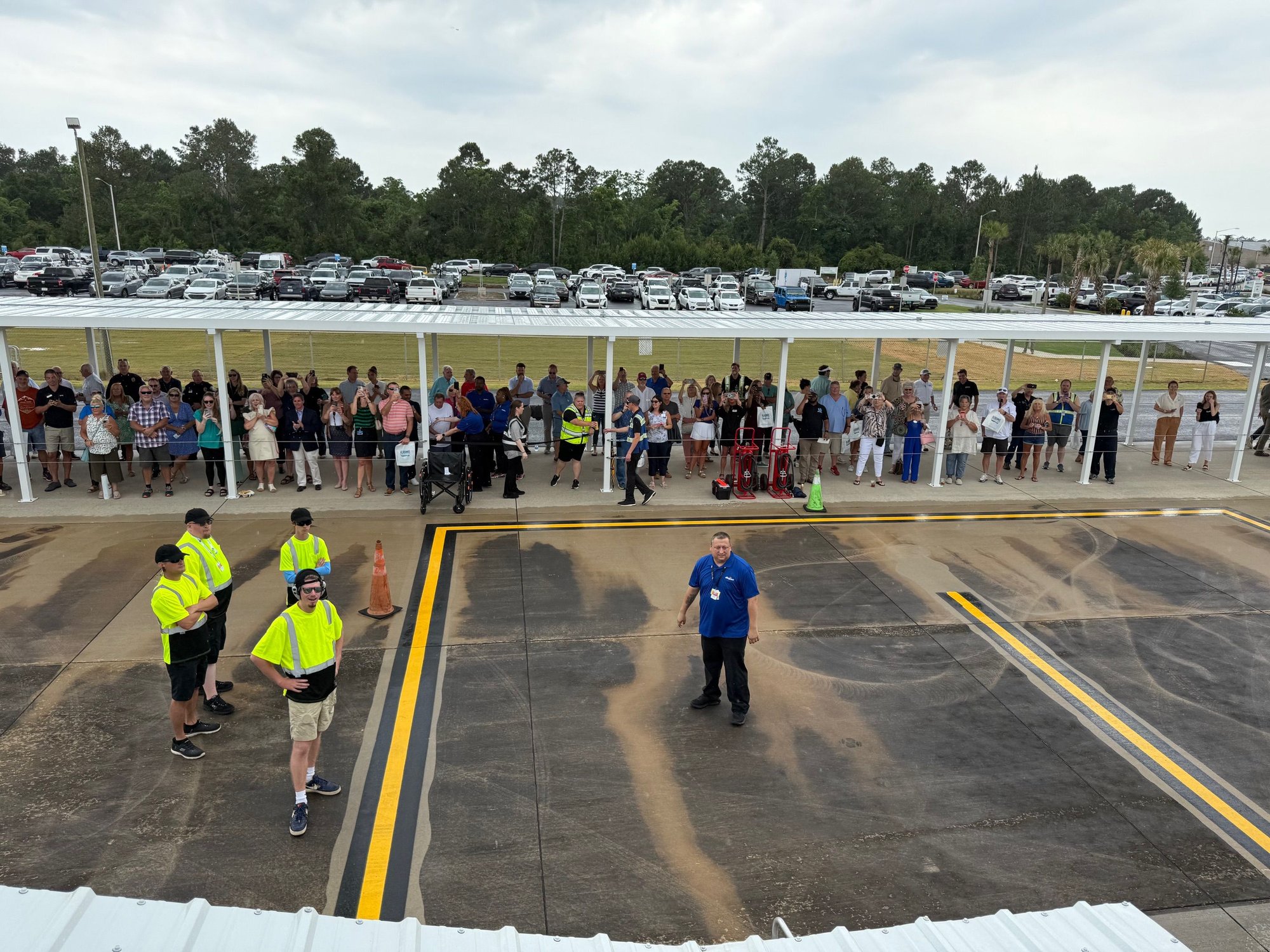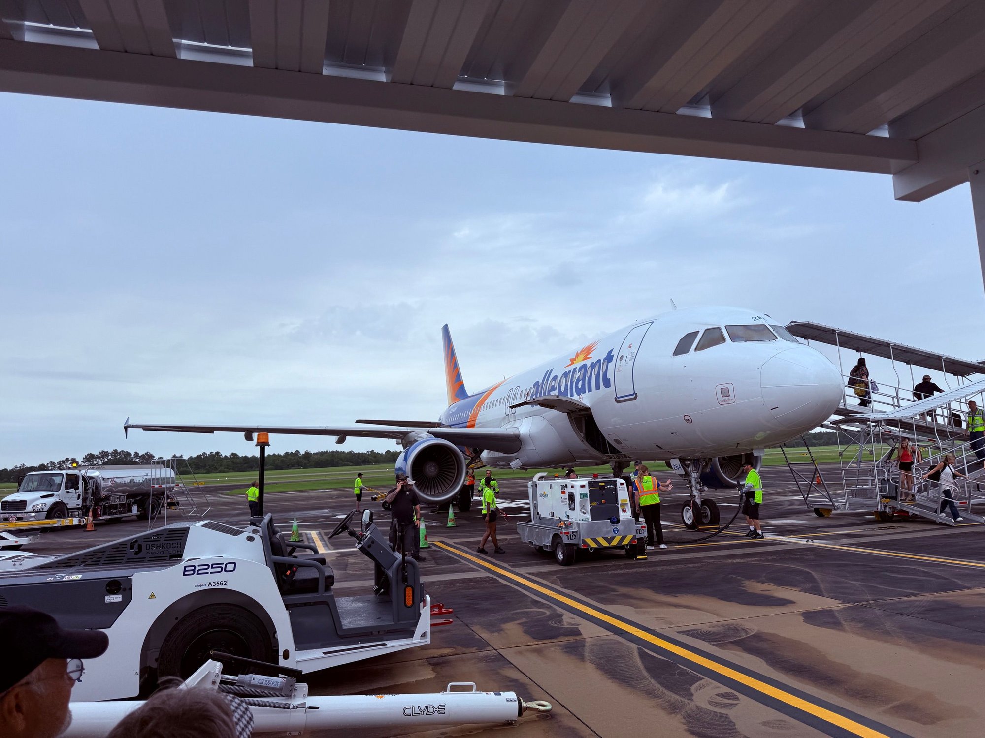 Landed to the west in light rain. Taxi to the parking position was initially slow as narrow taxiways and of course the crew’s first time there. As we entered the ramp, we again received water cannon salute and that’s when I could see probably a full THOUSAND people waiting to receive the flight, under a large tent set up on the ramp, all along the walkway from the parking spot to the terminal, at the fence, etc. People were holding signs, cheering, etc. No jetways here, just a moveable ramp which was quickly positioned. The door was opened by someone from the ground handling company with “Vice President” on their safety vest. We deplaned to cheers, applause, lots of people filming and taking photos. I’ve been on a lot of flights and a lot of inaugurals and not sure I’ve ever seen anything quite like this! Great to see people supporting new service. Advance bookings apparently well into the 80% range for the first half dozen destinations started the first week so on day one, Allegiant announced Appleton and Des Moines to Gulf Shores starting in a few months.
