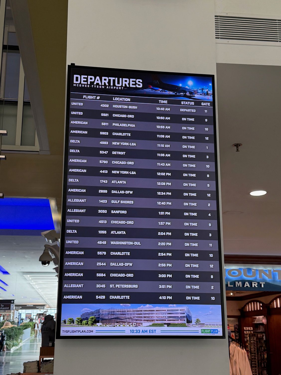 Thus sometime around 5am, set out on the 250 mile / 5 hour drive. Went down I-85 through Charlotte, across the good road to I-26 near the AVL airport, and then up to I-40 that way. I must say it’s quite an impressive sight to see 1.) what massive sections of interstate in the mountains/along the Pigeon River washed away from Hurricane Helene and 2.) all of the work done thus far shoring it up to be just 1 lane in each direction, limited to 35 mph for a 12-mile stretch. We made good time and arrived to the TYS airport just about 10am, well in advance of the 1240pm departure. Parking at TYS is an adventure as the garage was filled with pick-up trucks way too large for the space, parked on either side to the point where it was a little tricky maneuvering through some rows, and thought there were no open spaces until finding one finally on the far edge of the roof.