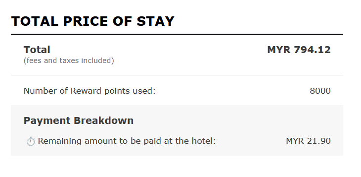 To avoid discussing definitions, let me just show the relevant parts from the original reservation. It was paid with 8000 points (already deducted), and 21.9 MYR remaining to be paid at the hotel.