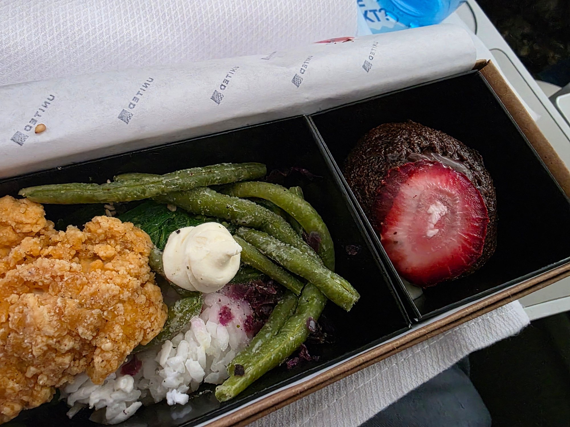 So the new UA Express lunch/dinner boxes have arrived, and honestly not bad, although mine was frozen. PDB was actually rose wine or water which was a first for me. Woman in front of my asked for white wine and the FA reluctantly brought it after some huffing and puffing. Hot towels and beverages/nuts were brought out after take off. All served in the new glassware and crockery which is nice since previously UAX had the hard plastic glasses (think they were the same ones used in Polaris on the ground). FA said there was a choice of chicken wrap, veggie wrap or cheese box. I selected the chicken wrap and I have to admit the quality seemed much nicer than the previous sandwiches that they would serve on UAX. The poke salad served with it was nice with edemame, pineapple, seaweed salad, etc. And the chocolate lava cake was delicious! However the entire thing was frozen! I still ate most of it as I was starving but they need to let these thaw more. From what I could tell, everyone around me had frozen meals too. Not sure if this was a fluke or it happens all of the time like the Polaris salads. I will write to UA and let them know. If they can fix that, this is a pretty good meal.