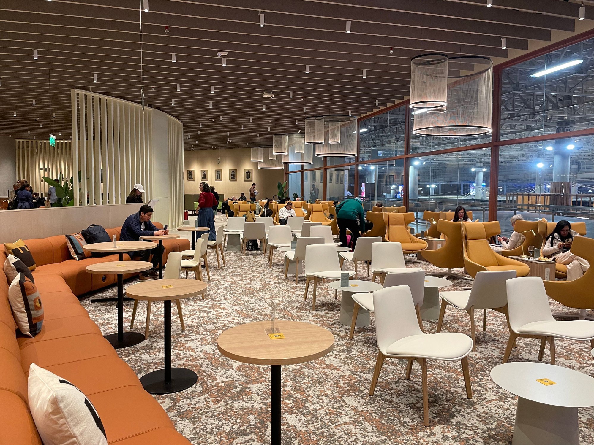 The lounge is 1400 sqm large so there is plenty of space. There were different seating areas, two food buffets a manned bar, as well as workstations and a rest area.