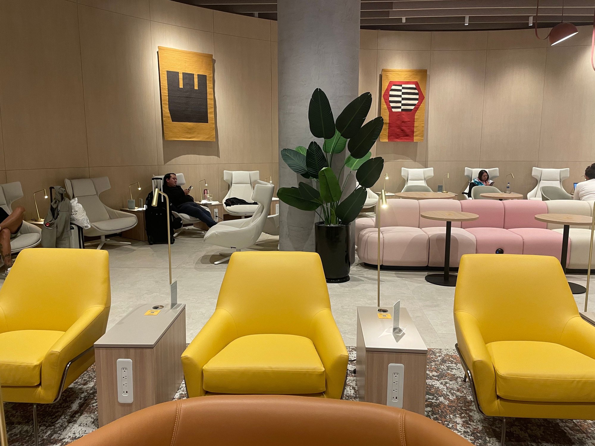 The gate area does seem more basic. There is not a lot of natural light, seats are a bit scares and there are no power outlets.