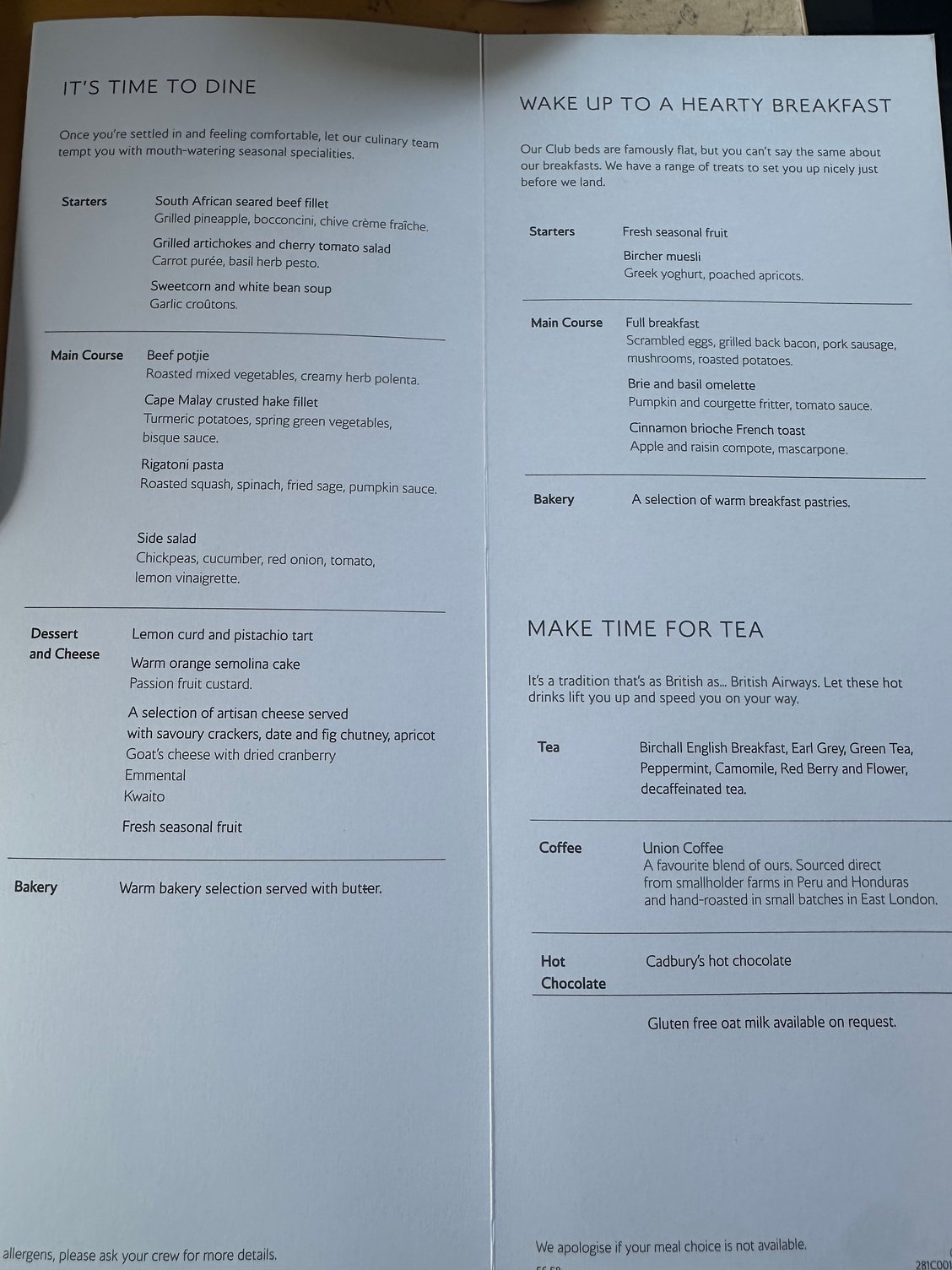 While outbound BA55 on 21 May had a repeat of menus previously posted, the return flight had some options that seemed to be new.