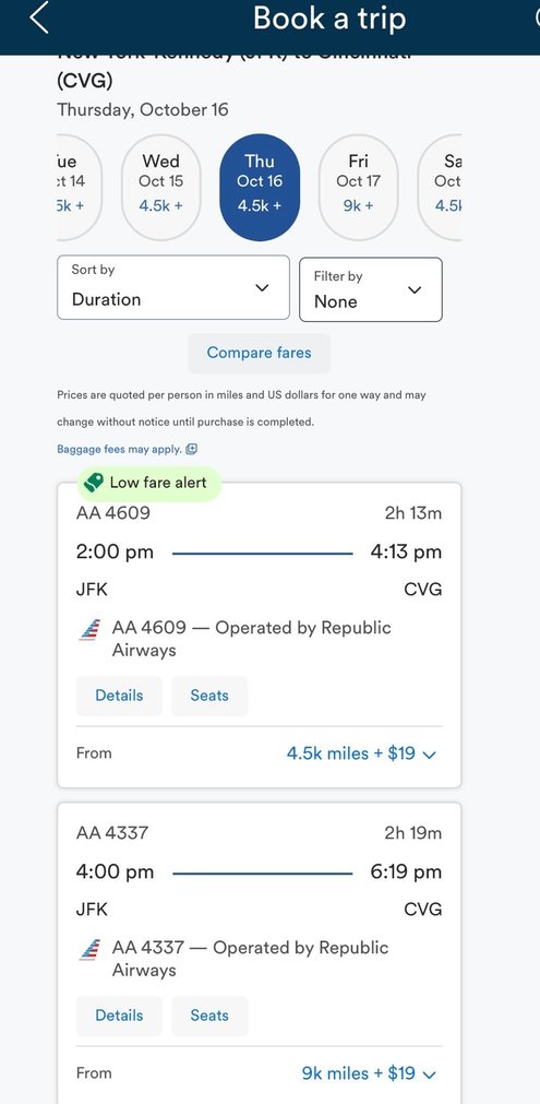Thurs afternoon JFK-CVG — these are AS awards on AA metal (the later flight is F, but still …)