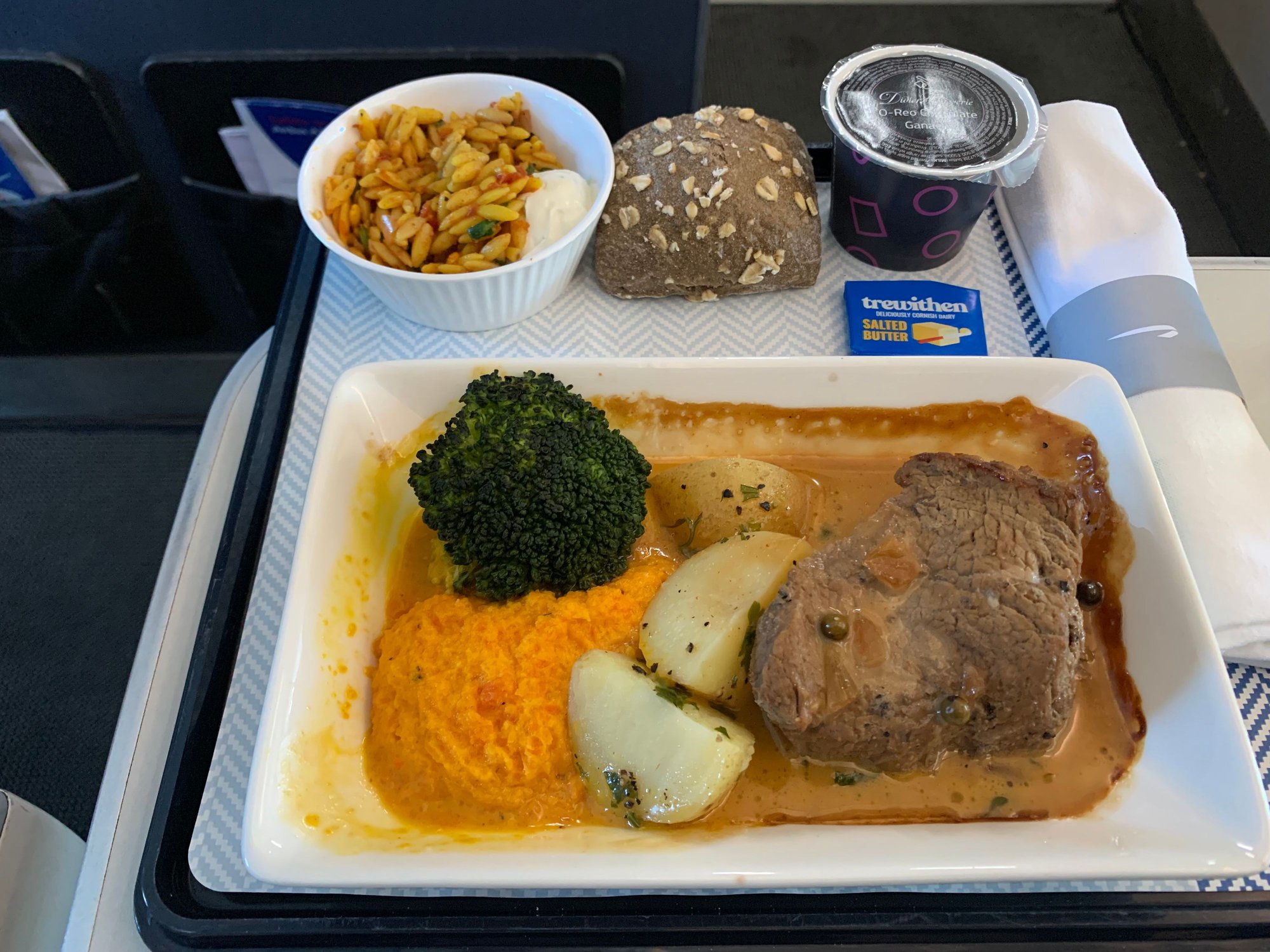 We had the beef which was very tender, quite tasty, but not quite as moist as it could be.or in all we left the flight feeling quite well fed and not needing anything until the evening