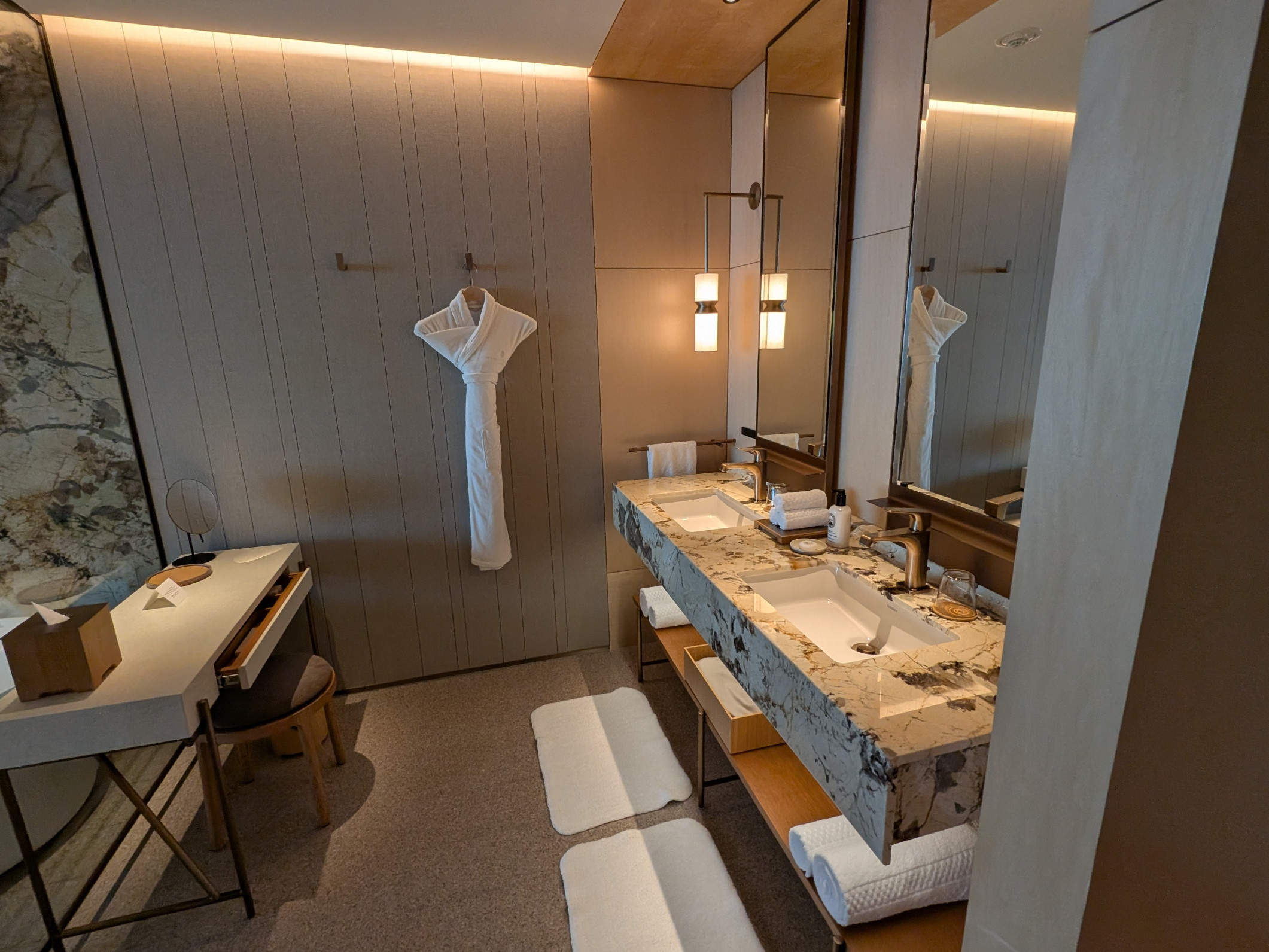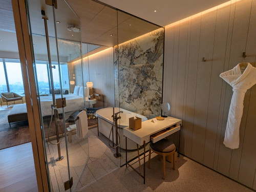 You can tell it's a five star hotel because the bathroom is completely transparent (to be fair, during turndown service, they did pull closed some shutters that offered a bit of privacy inside the bathroom).