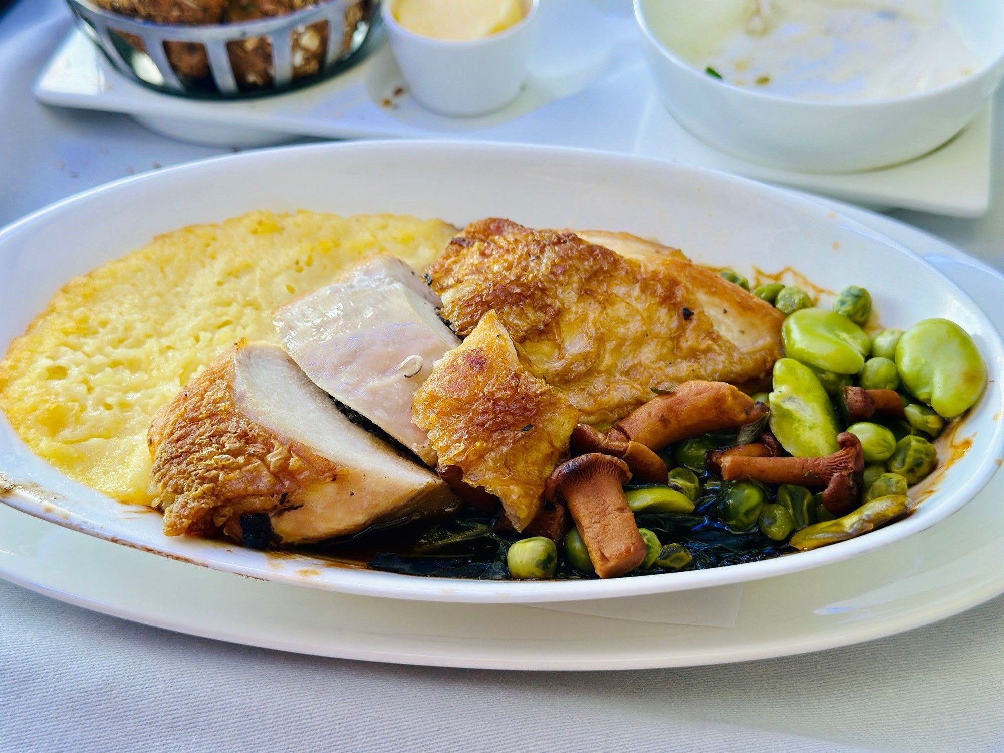 Mushroom & Kale Stuffed British Chicken, spring greens, creamed potatoes, herb jus