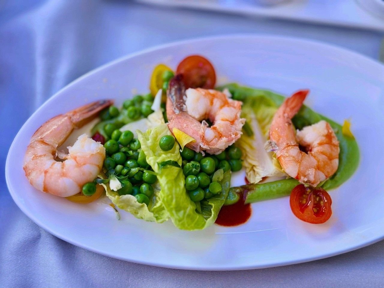 Poached Prawn Salad, minted broad beans, peas, avocado cream, homemade lemon ketchup