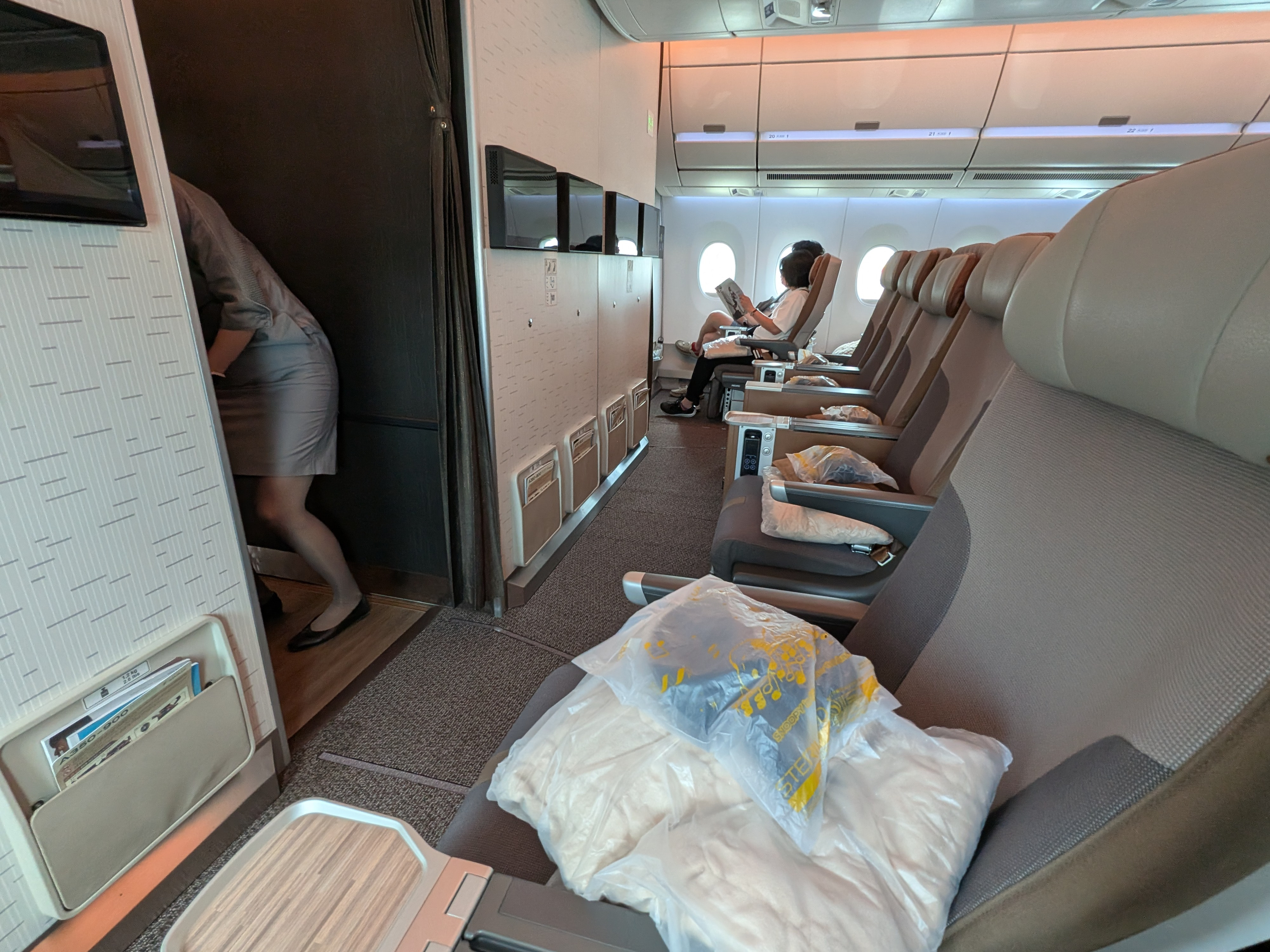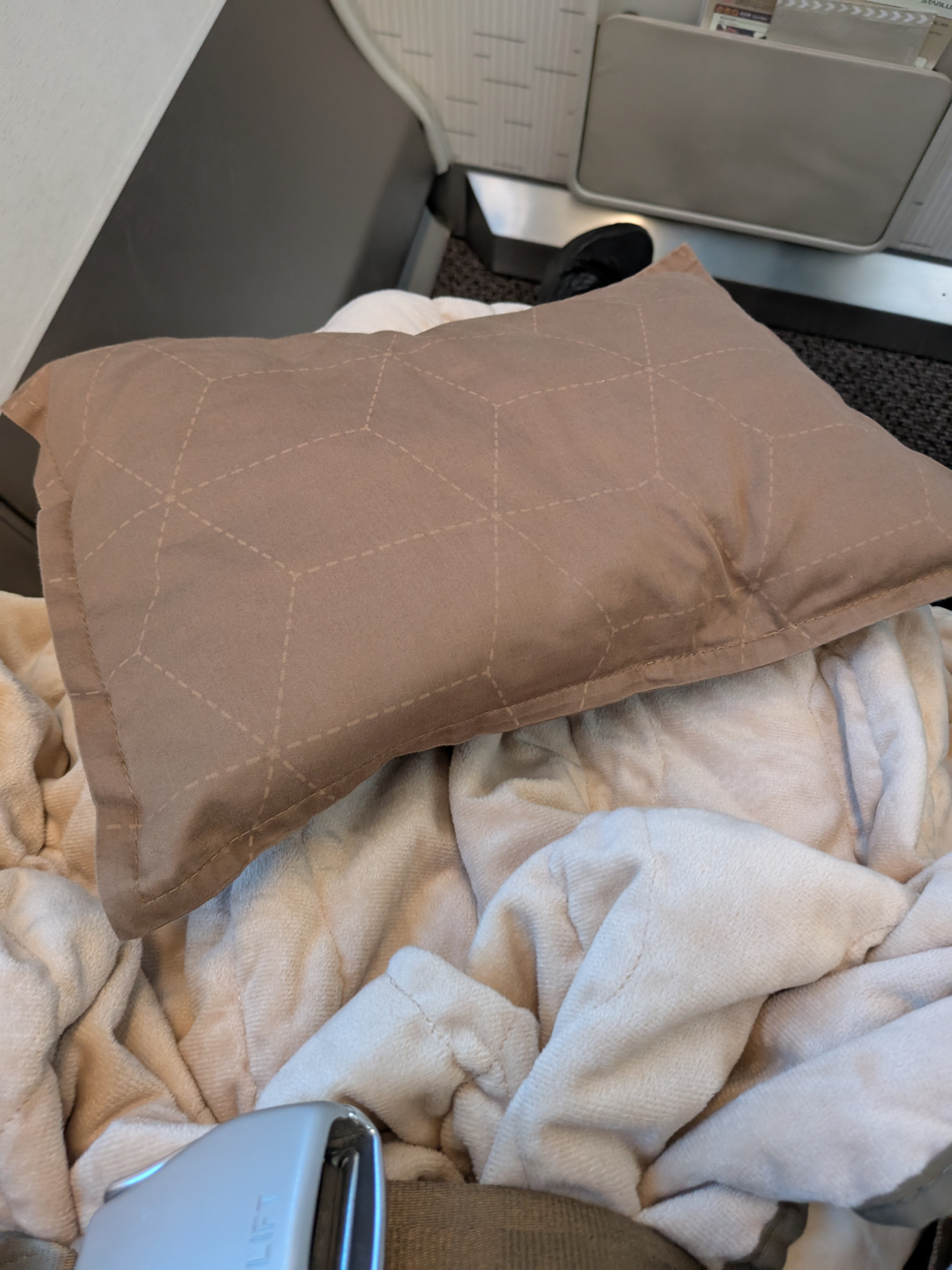 Provided with the seat were a thin but respectably soft blanket and a not-very-good pillow.