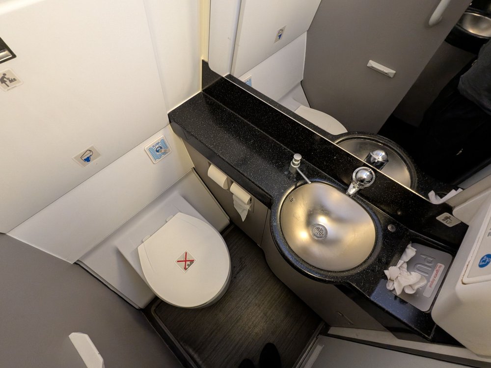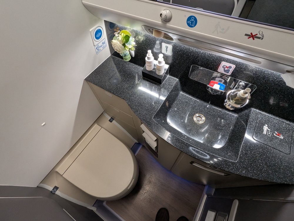 Still no foot pedal for the trash lid. I should've checked the lavatory on my JAL flight; I bet they would've had it. There were some simple toiletries here but it seemed most of what you needed would be found in your amenity kit.