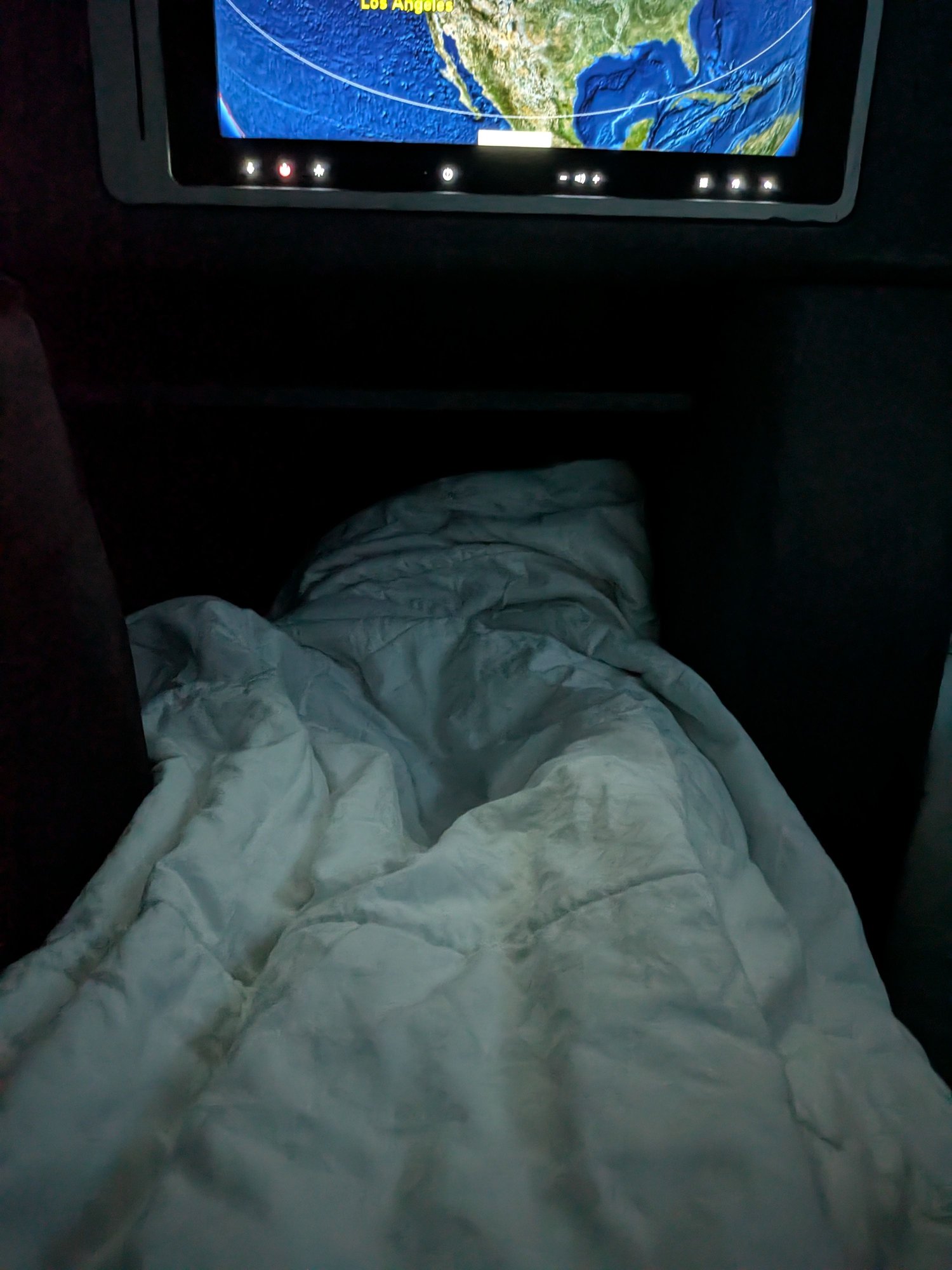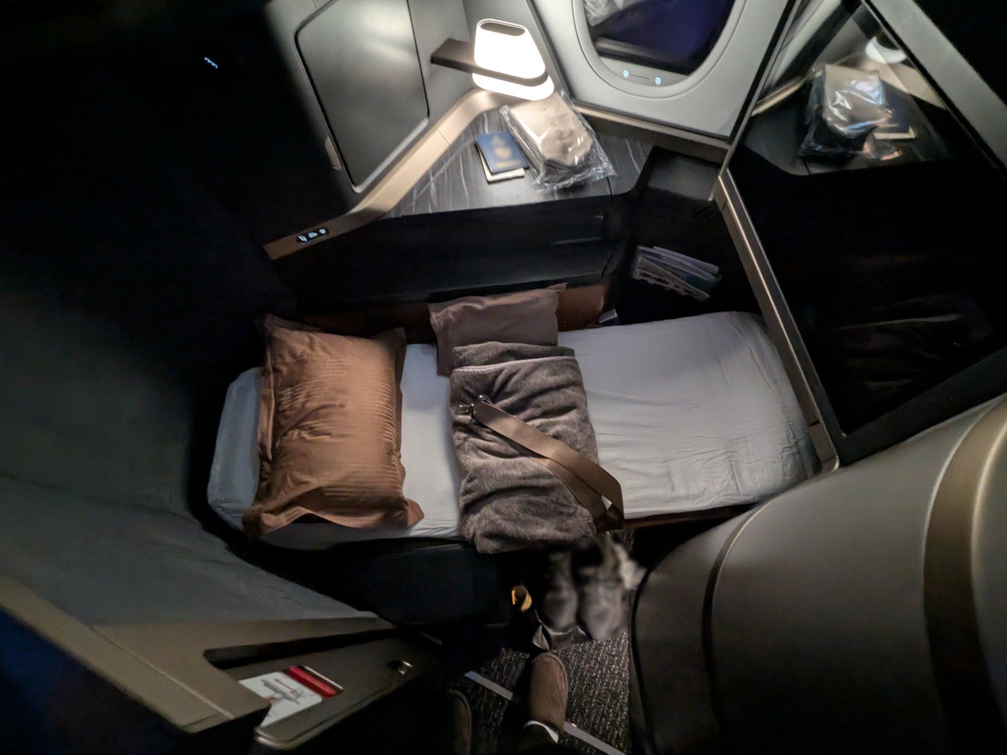 This is a bad picture, but the footwell was quite large. Probably a similar size to the old Cathay reverse herringbone I flew earlier. I was quite comfortable stretching out and sleeping here.