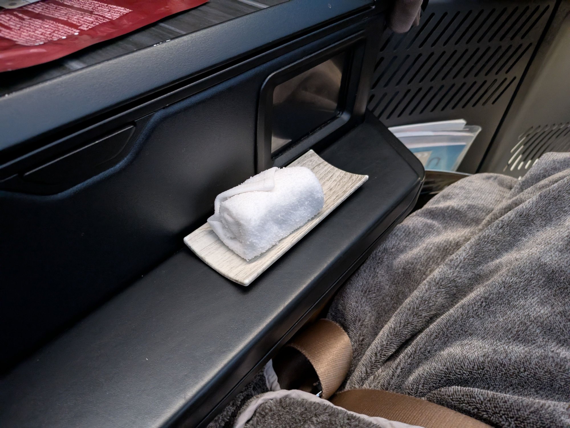 When I woke up, flight attendants presented me with another hot towel and also a face essence mask thing? I got a solid 4 or 5 hours of sleep, which I was really happy with.