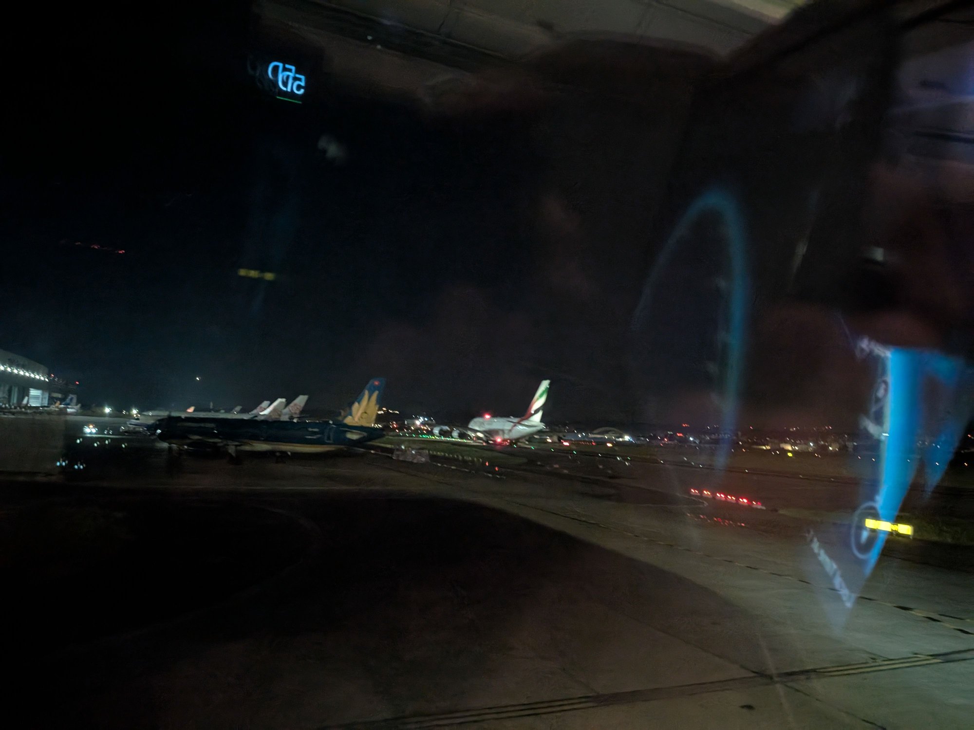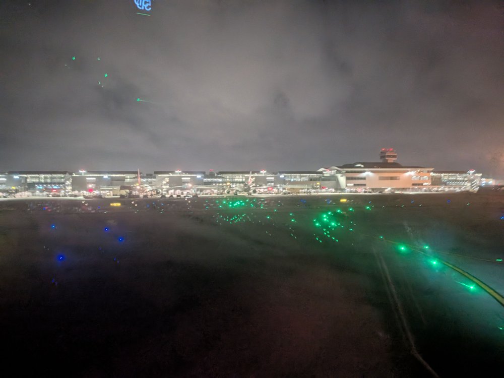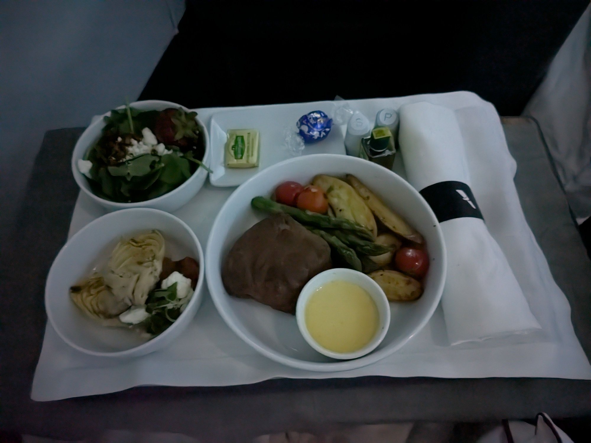 Many people went straight to sleep, so the cabin was kept in darkness for the entire meal service. Night Sight on my phone is doing a much better job of seeing what was happening than I could. This is basically what I was looking at: